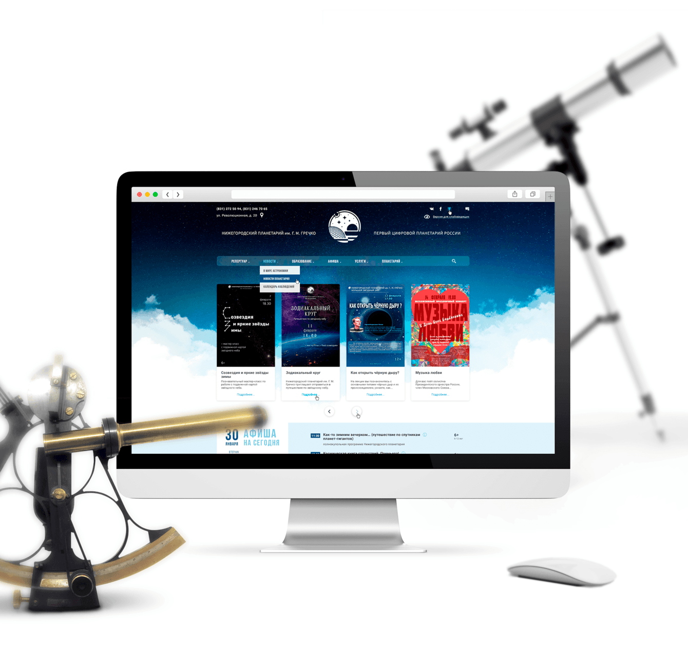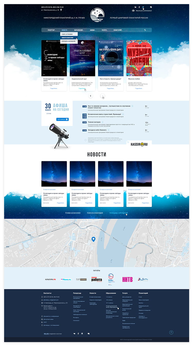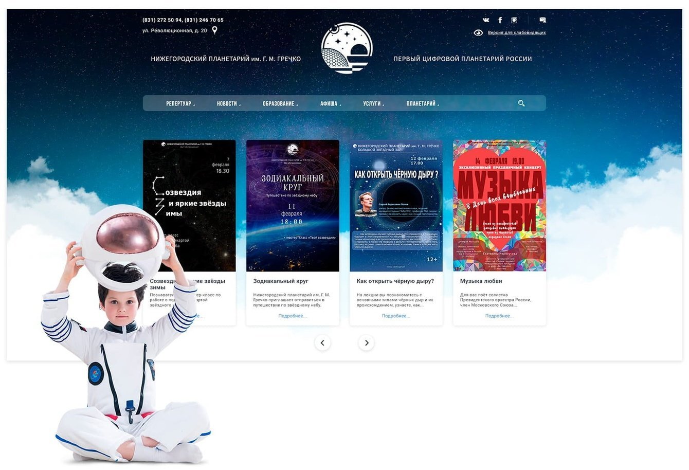 Нижегородский планетарий имени дважды Героя России лётчика-космонавта Г. М. Гречко - первый в России планетарий, оснащённый современной цифровой многопроекторной системой визуализации «Argus Planetarium» высочайшего разрешения. Смотреть на звёзды в таком разрешении очень круто! Поэтому мы с удовольствием работали над новым сайтом планетария.