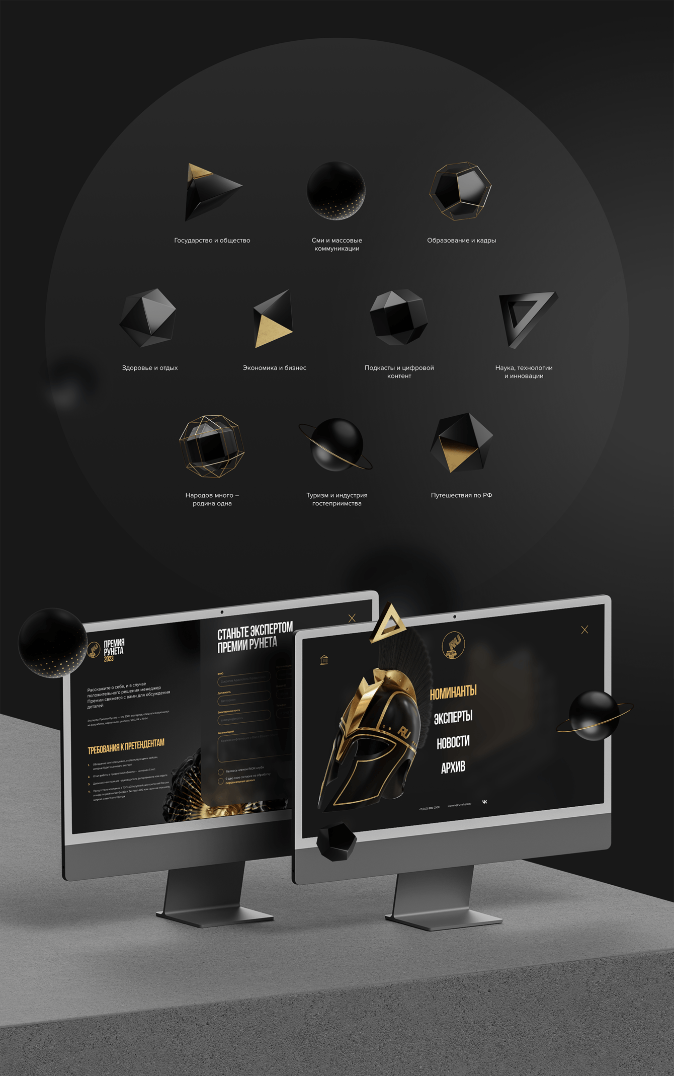 Опираясь на античную колонну в награде «Премии Рунета», мы решили поддержать тему античности и во внутренних страницах. Для этого были созданы трёхмерные модели известных персонажей и атрибутов того времени. Каждая модель соответствует определённому разделу сайта.