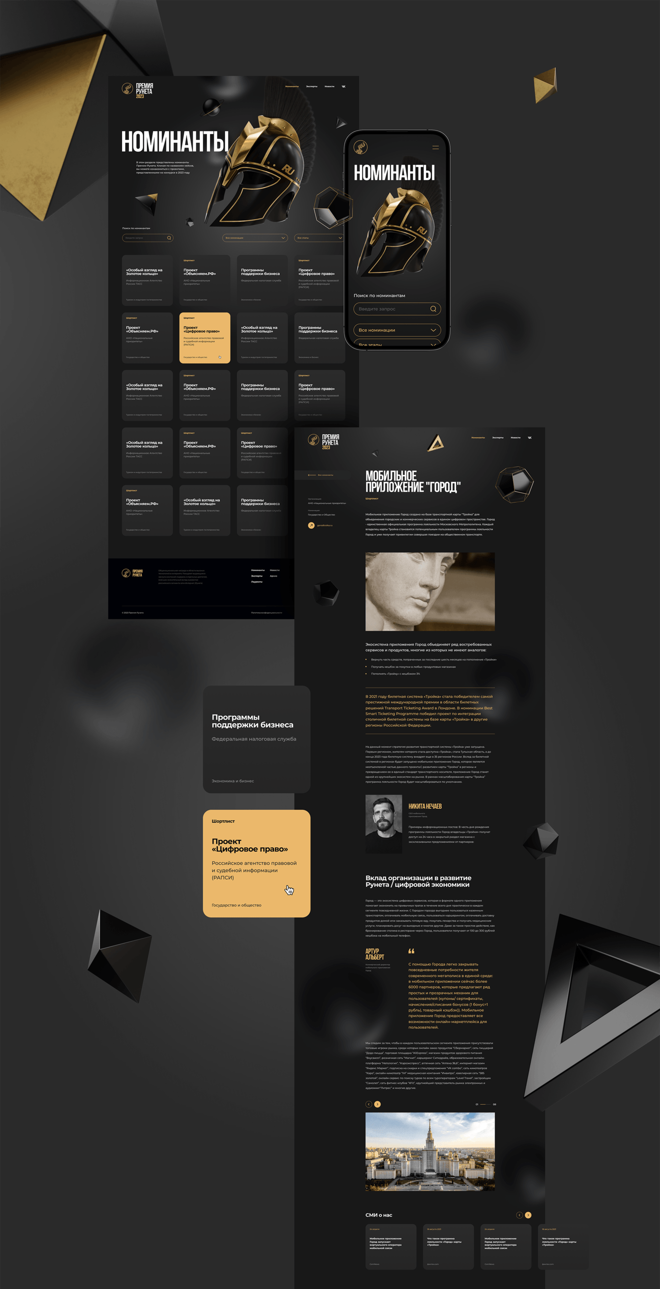 Премия Рунета — это одна из главных национальных наград в области интернета и высоких технологий. Поскольку это знак качества для интернет-проектов и ИТ-компаний, то сайт премии — по сути её лицо — должен быть эстетичным и актуальным. На 20-летие премии мы решили обновить дизайн сайта и обратились за этой услугой к Notamedia как к надежному партнеру уже на протяжении 15-ти лет. Теперь, открывая сайт Премии Рунета, нас встречает золотой «Оскар Рунета» — заветная статуэтка, которую хотят получить все. Сам же дизайн сайта лаконичный, понятный, отвечает всем трендам и при этом отражает концепцию премии и ДНК нашего бренда. Огромное спасибо Notamedia, что учли все наши пожелания, сделали всё быстро и качественно!
