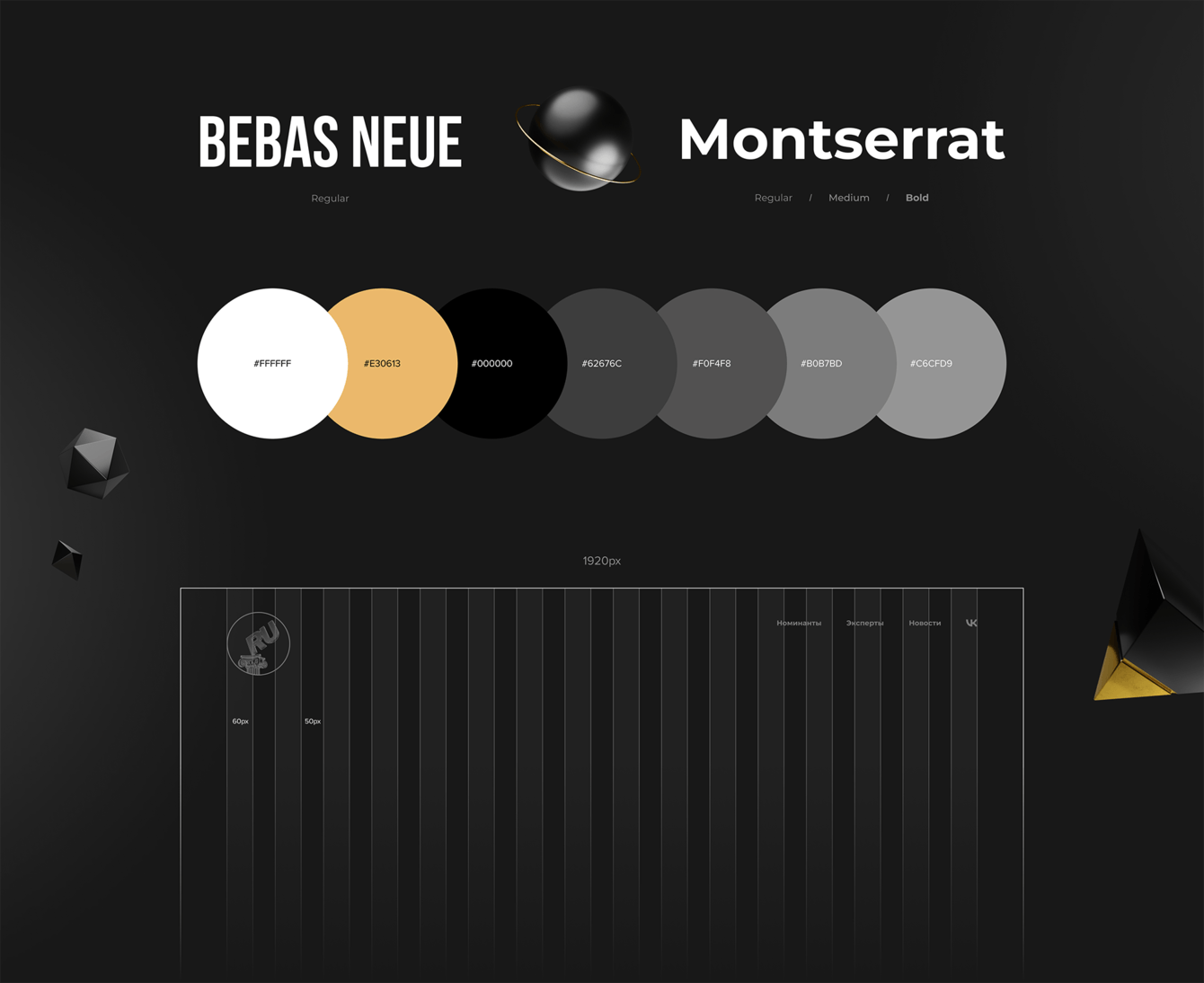 Премиальная стилистика выражена благородным сочетанием золотого и белого на тёмном фоне. В заголовках используем для акциденции узкий гротеск на контрасте с минималистичным наборным шрифтом.