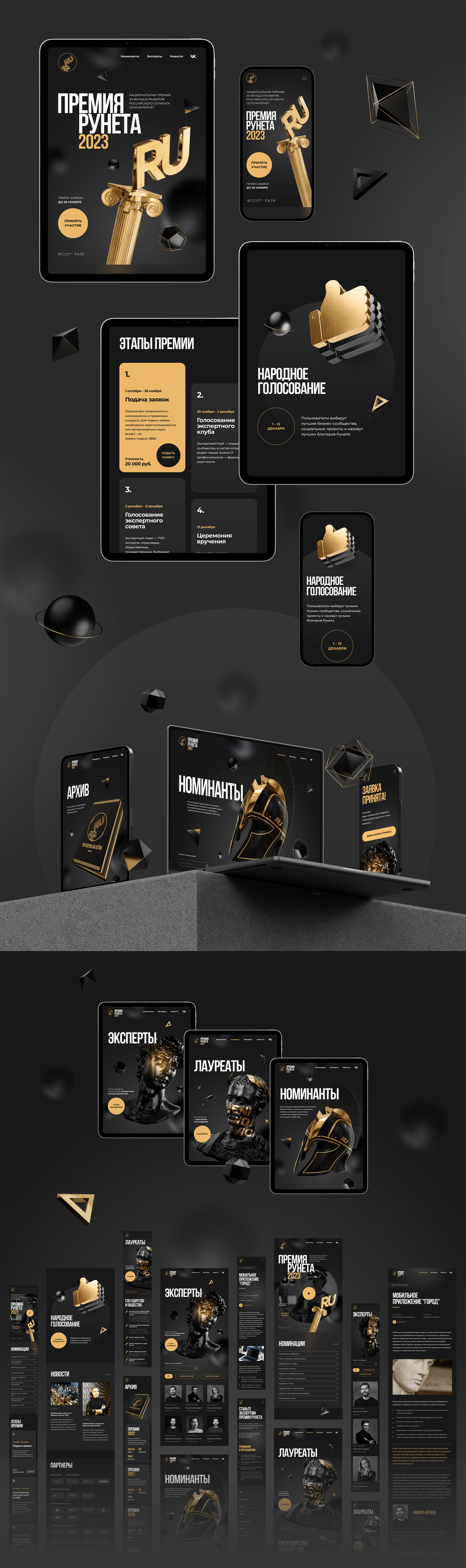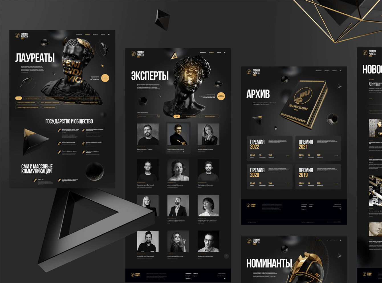 Золотая колонна с ионической капителью наиболее узнаваемый символ Премии Рунета. Поэтому стилистику мы построили на торжественной черно-золотой цветовой гамме и отсылкам к античным скульптурам в иллюстрациях сайта. Чтобы не переборщить с пафосом в некоторых элементах, добавили немного самоиронии. С Цезарем ассоциируются не только великие цитаты, но и креветки, а скульптура Давида разными частями присутствует на двух страницах, напоминая про времена «великой кастрации».