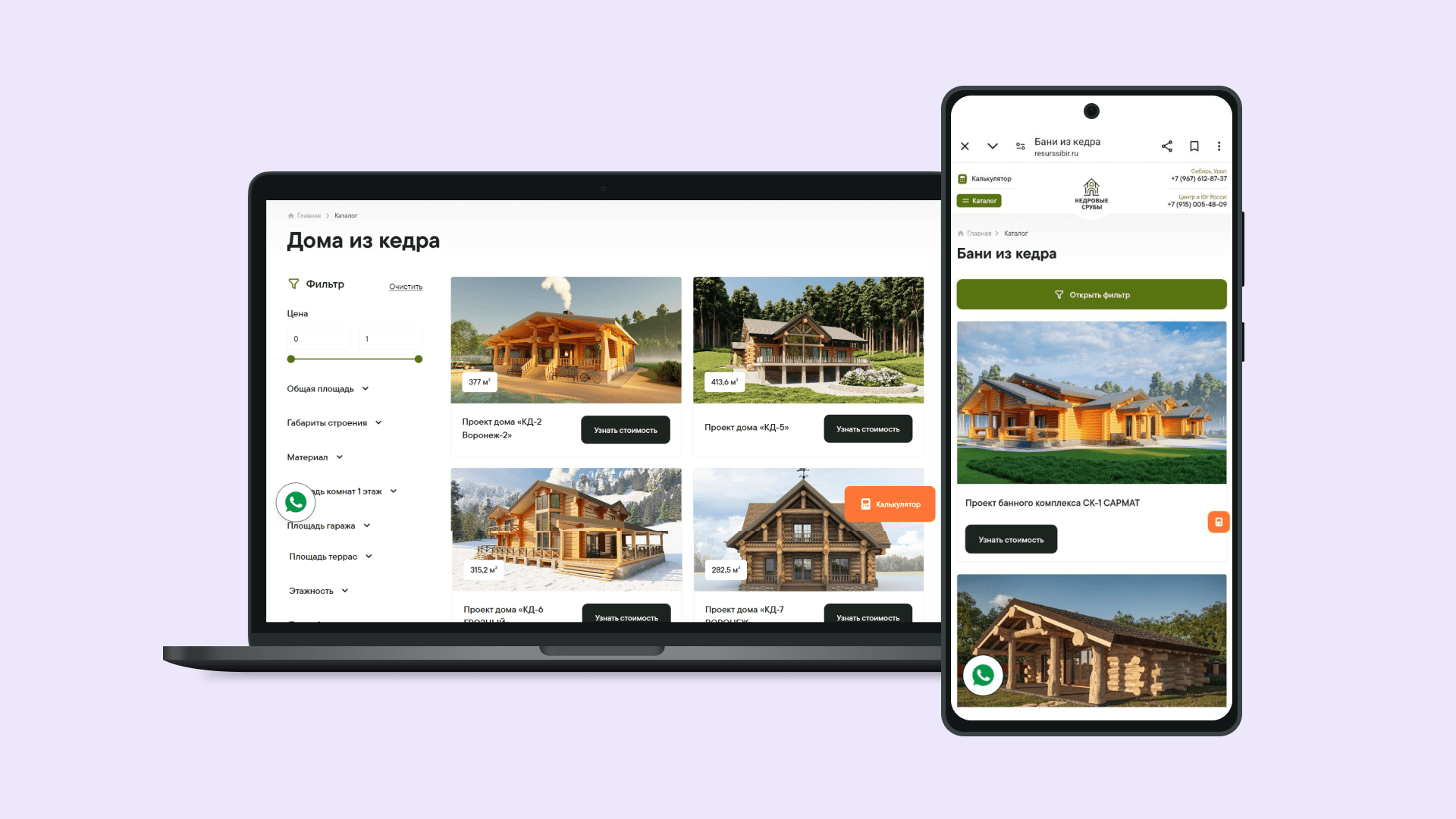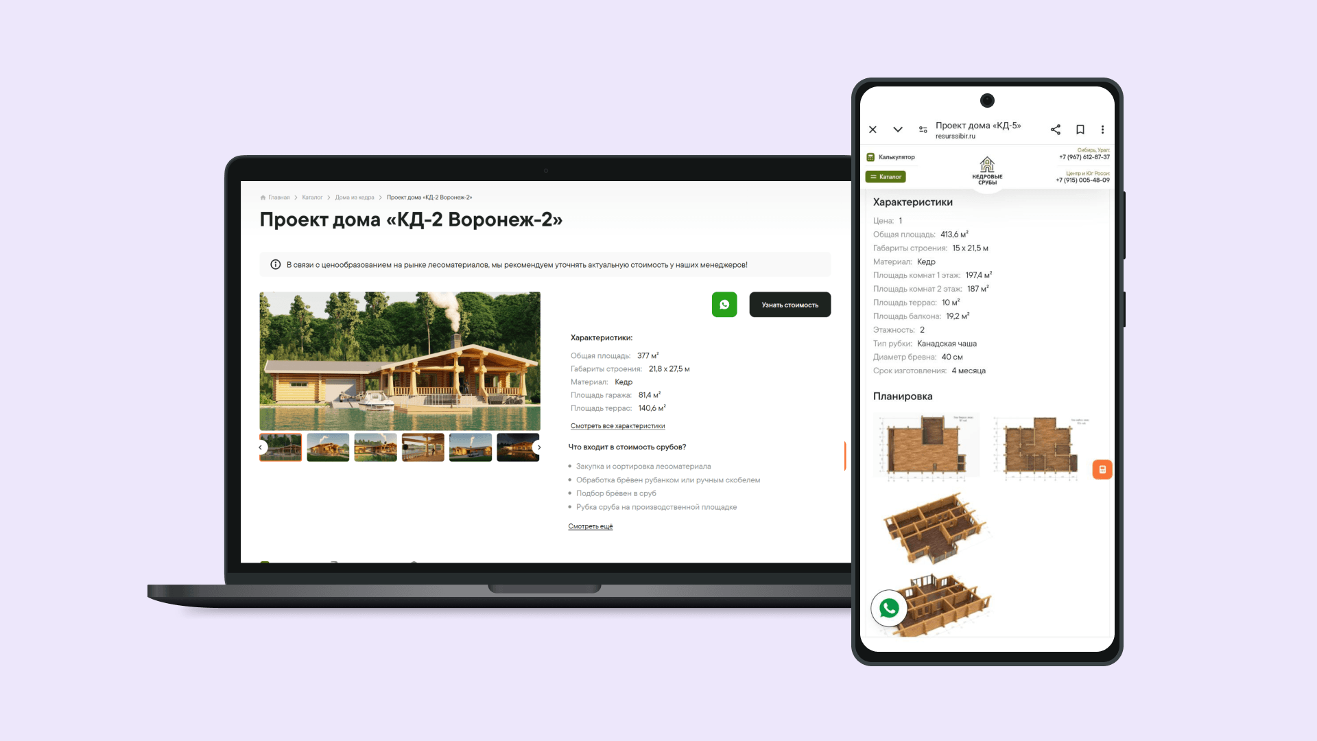 - Баннер с изображением готового кедрового проекта, слоганом и кнопкой призыва к действию («Узнать подробнее» / «Калькулятор»).