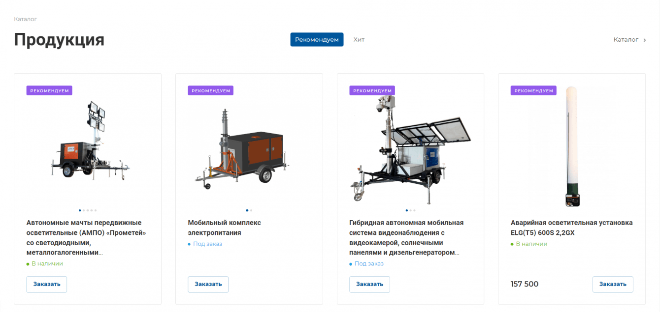 Большой раздел отведен под каталог компании. Есть раздел услуг про аренду. Кроме того, представлены комплексные решения под ключ для больших проектов с описанием преимуществ и формой захвата.
