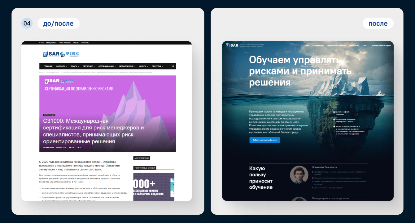 Команда SUPPORT AGENCY сделала полноценный редизайн сайта риск-академии ISAR. Сайт стал удобнее для пользователей и обрел современный дизайн. Теперь он полноценно раскрывает все преимущества курсов и рассказывает о профессионализме экспертов.