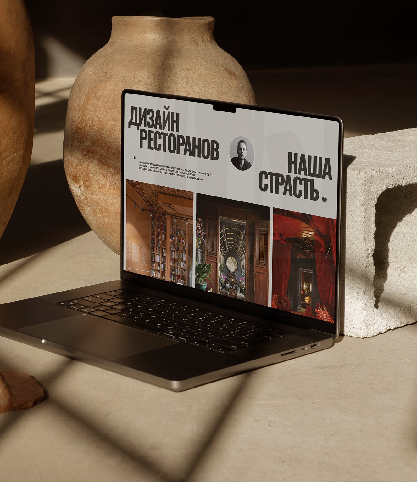 В дизайне сделали акцент на крупных, детальных презентациях проектов и добавили атмосферное видео с командой, чтобы подчеркнуть человечность и профессионализм студии.