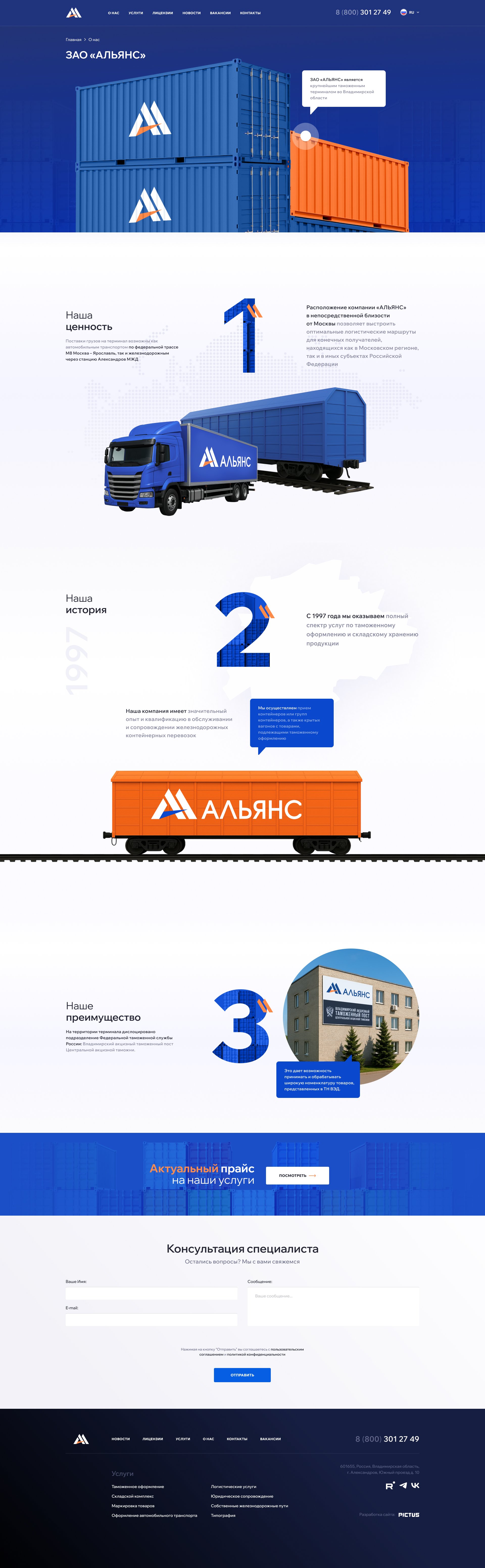 Основная структура сайта осталась практически без изменений. На страницах были реализованы новые блоки с возможностью добавления фото и видео материалов, а также ссылки на скачивания прайса услуг компании.