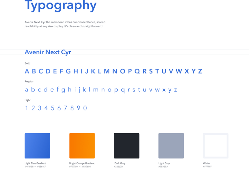 В качестве основного шрифта сайта был выбран Avenir Next Cyr. Этот лаконичный шрифт без засечек с четкими гранями удобно воспринимать с экранов любых размеров. Он выражает чистоту и ясность образа компании.