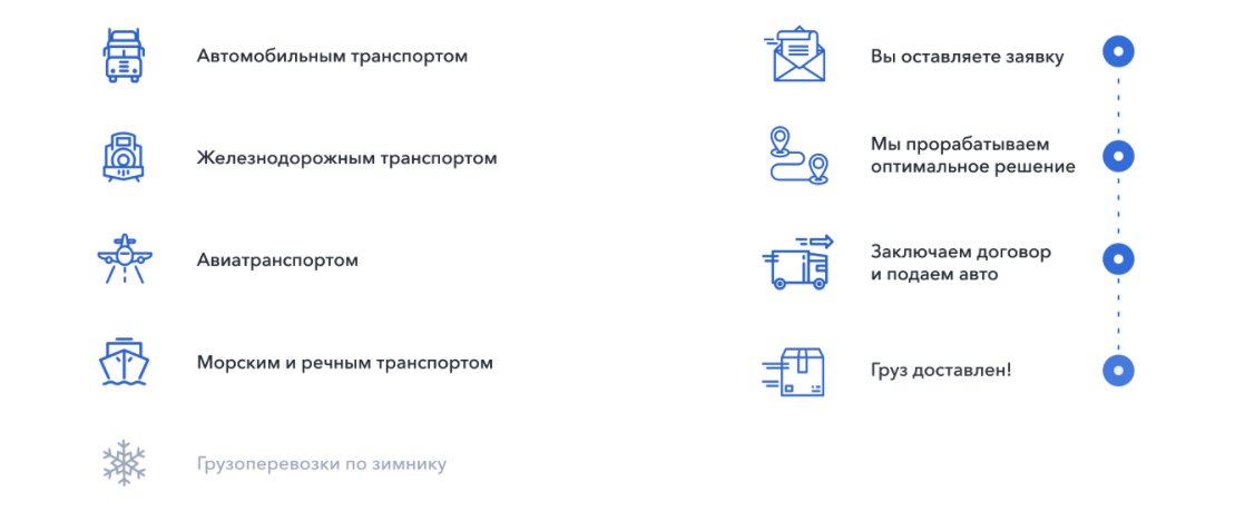 На каждую страницу были добавлены уникальные иконки, выгодно выделяющие компанию среди конкурентов. Некоторые из них, например, обозначают транспортные категории, другие – стадии оформления грузоперевозки.