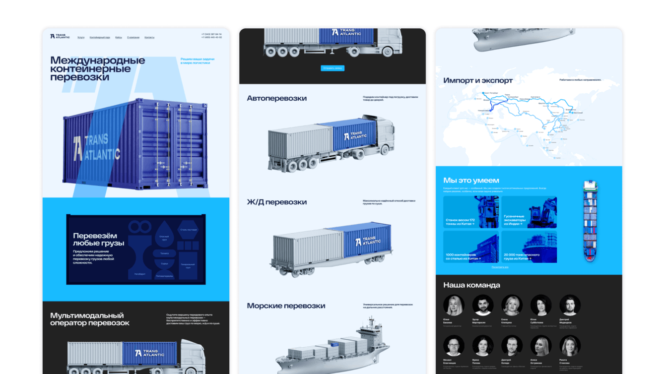Как и для подачи информации, так и для визуального стиля JetStyle выбрали лаконичность. Для фона использовали оттенки серого, а для расстановки акцентов — оттенки синего, в цвет фирменных контейнеров «ТрансАтлантик».