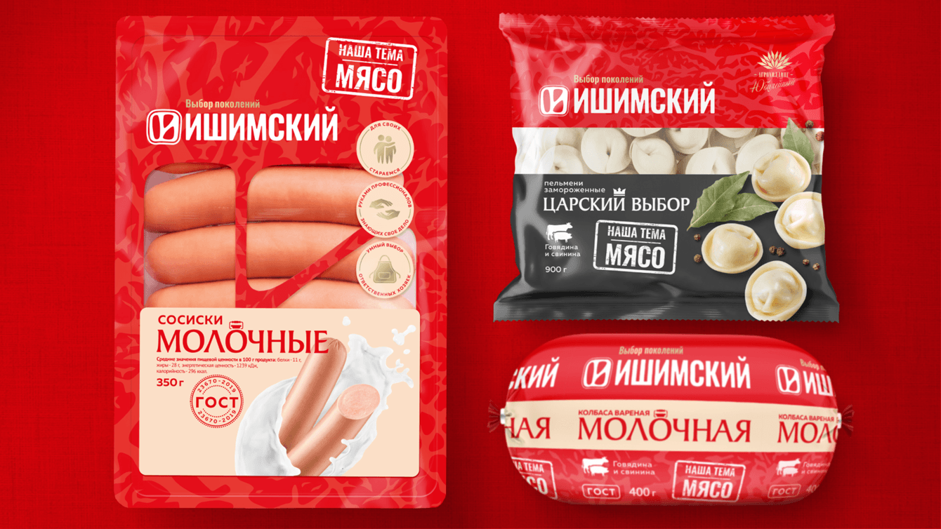 На красном фоне этикеток появляется паттерн, повторяющий рисунок мясных волокон. Это позволяет развить идею, заложенную в лого и подчеркнуть УТП продукции комбината. Оптимизация фирменного цвета, лаконичная верстка и современная инфографика завершают обновленный образ Имимского. Теперь у бренда есть все, чтобы действительно быть выбором разных поколений.