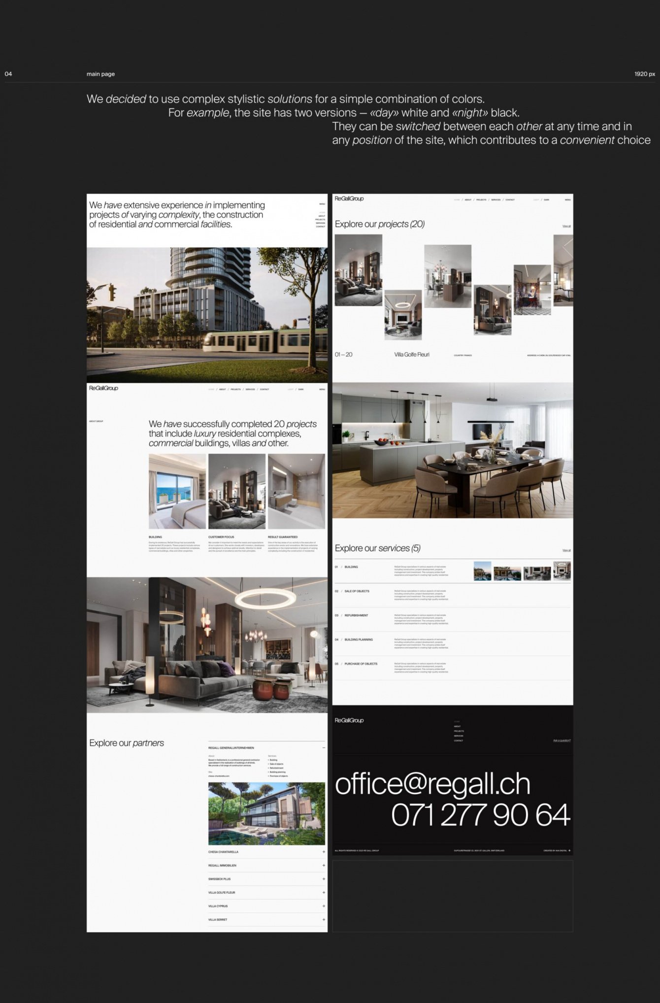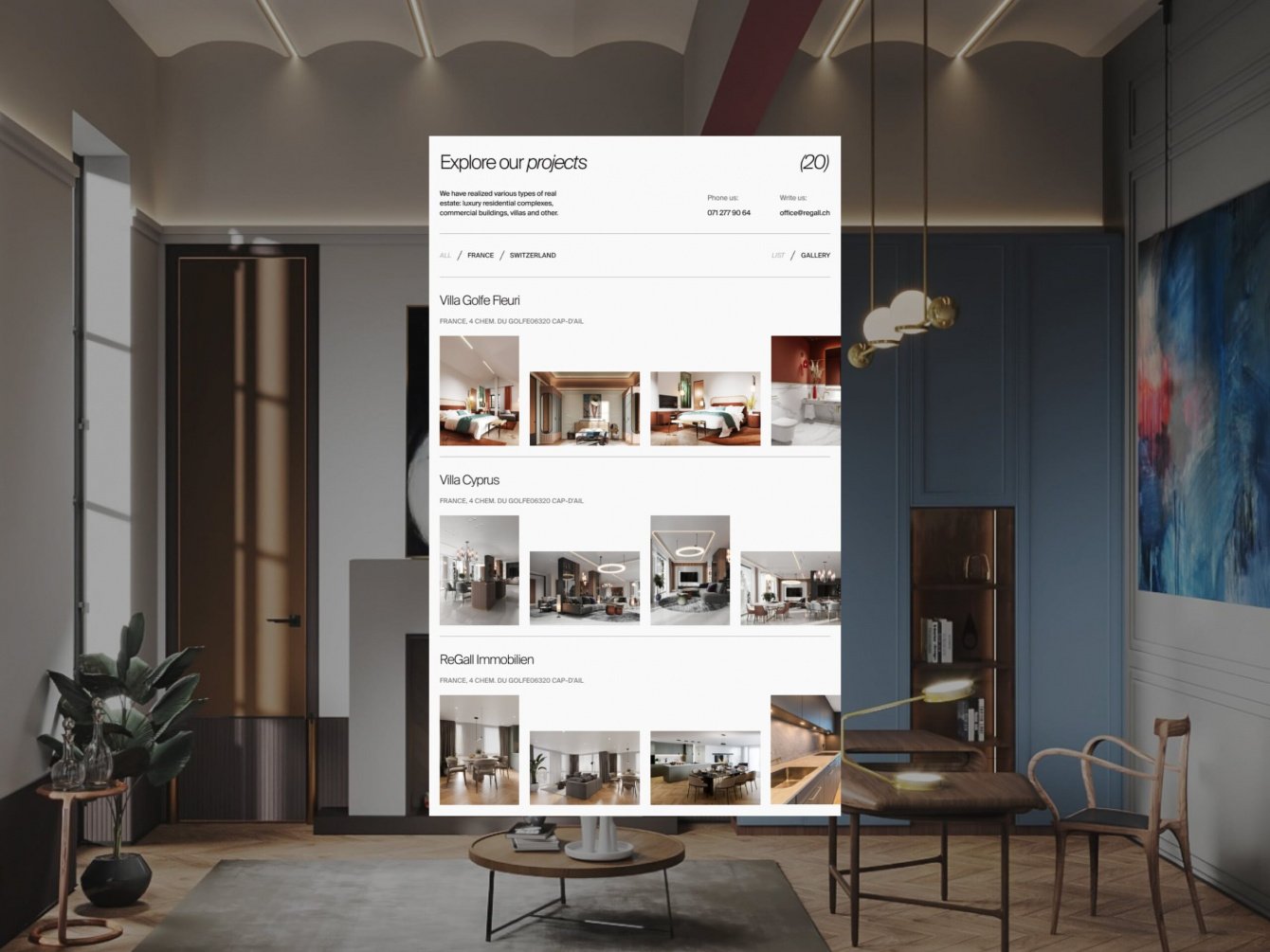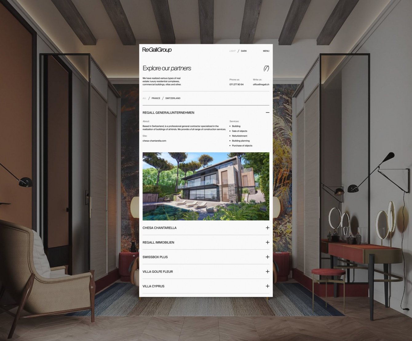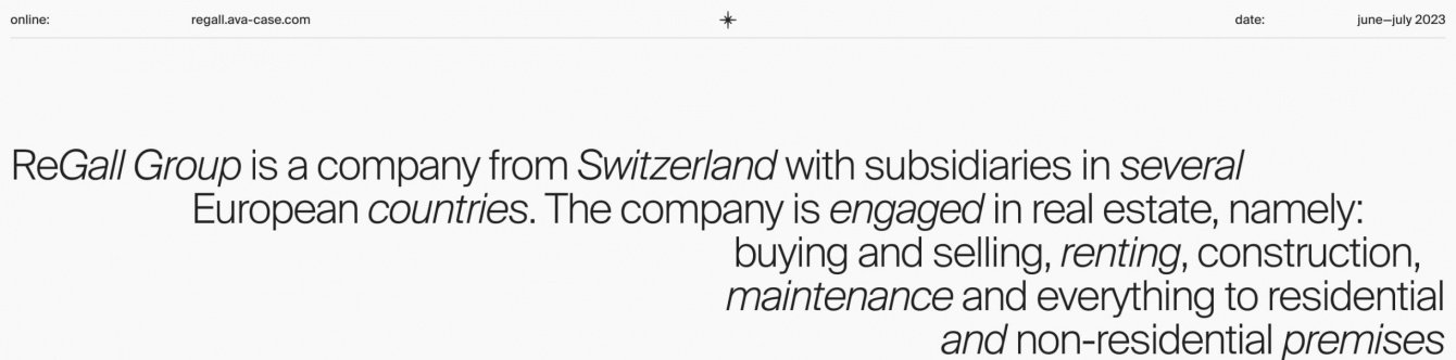 ReGall Group - компания из Швейцарии с филиалами в нескольких европейских странах. Ребята занимаются недвижимостью - буквально всей: покупка и продажа, аренда, строительство, обслуживание и все, что связано с жилыми и нежилыми помещениями.