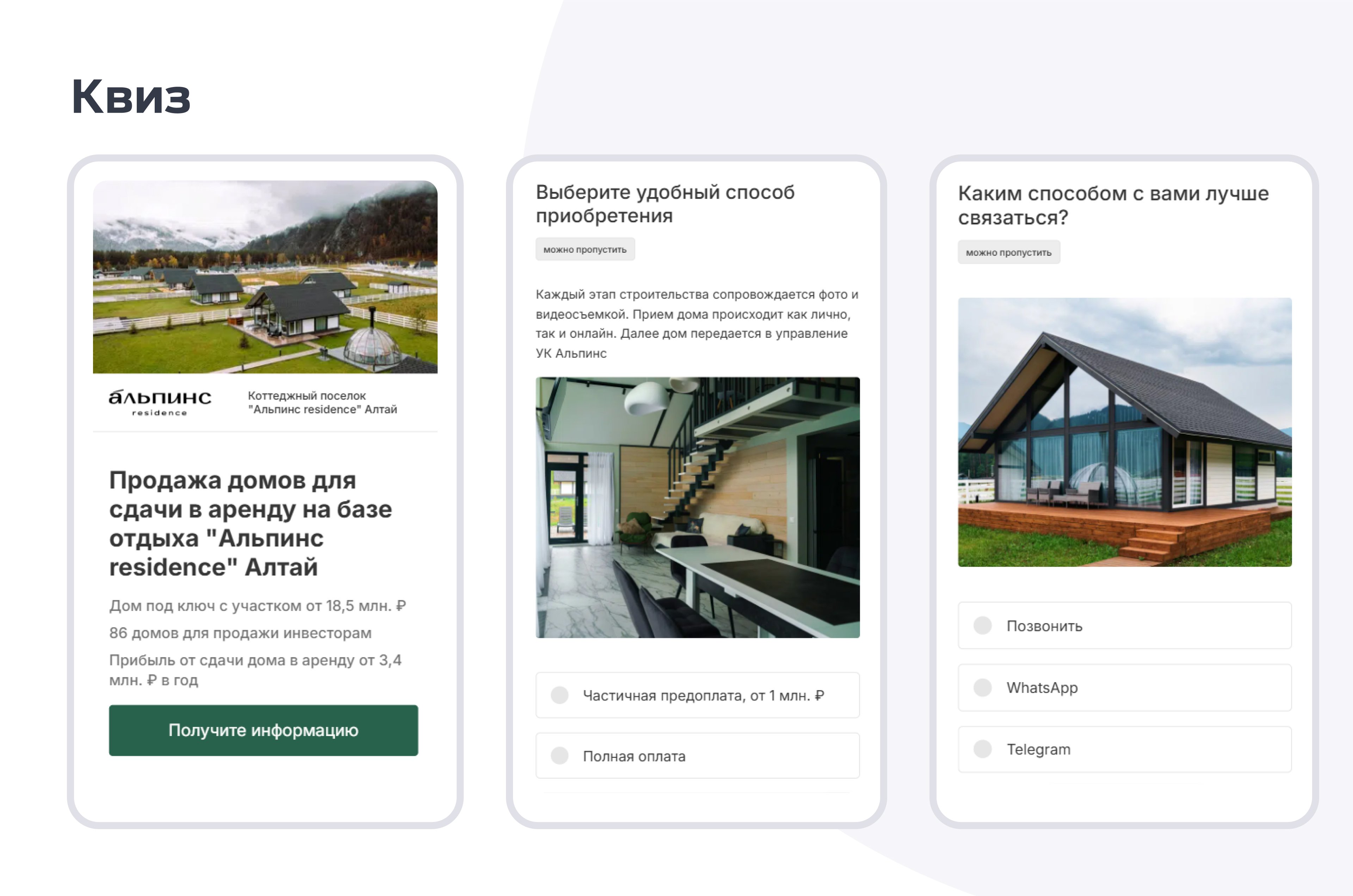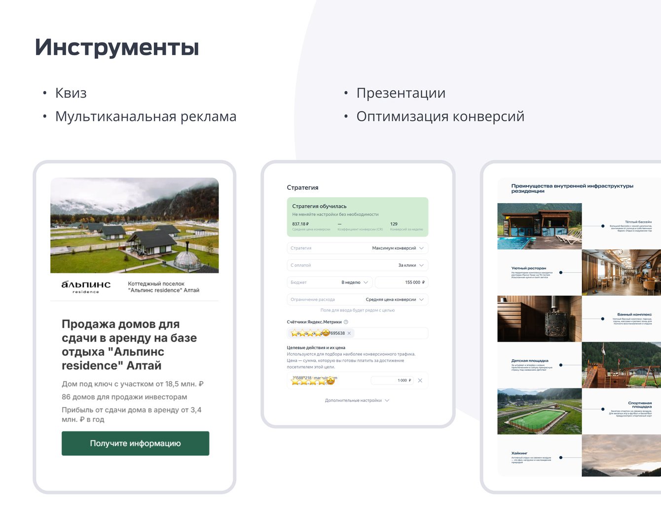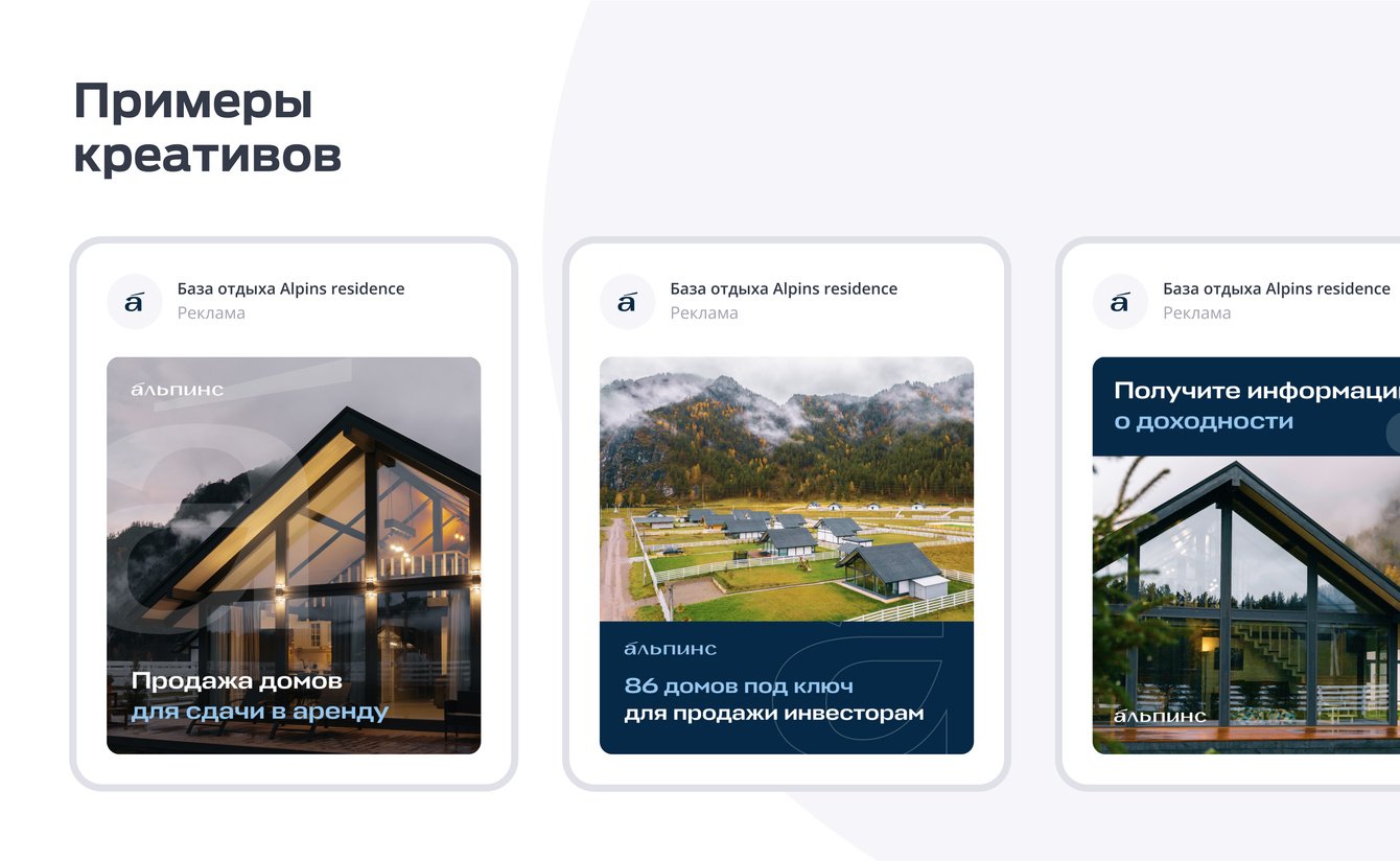 Поиск инвесторов для продажи домов под сдачу на базе отдыха "Alpins residence" Алтай. Обеспечить охват по всей России с максимальным отсевом аудитории. Задействовать максимальное количество подходящих рекламных площадок. Разработать сайт, презентации, квизы и рекламные материалы. Организовать нативные интеграции.