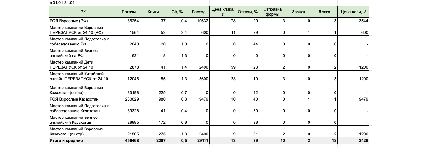 Далее от клиента поступил запрос на рекламу таких направлений, как «Подготовка к собеседованию» и «Бизнес английский» с географией показов Россия и Казахстан. По этим направлениям мы также создали Мастера кампаний с оплатой за конверсии, разграничивая РК по географии показов. Из старых кампаний на заграницу в географии показов мы оставили только Казахстан, так как он был самым конверсионным, а ретаргетинг с акцией по Черной пятнице отключили, так как акция закончилась. Статистика по кампаниям за январь: