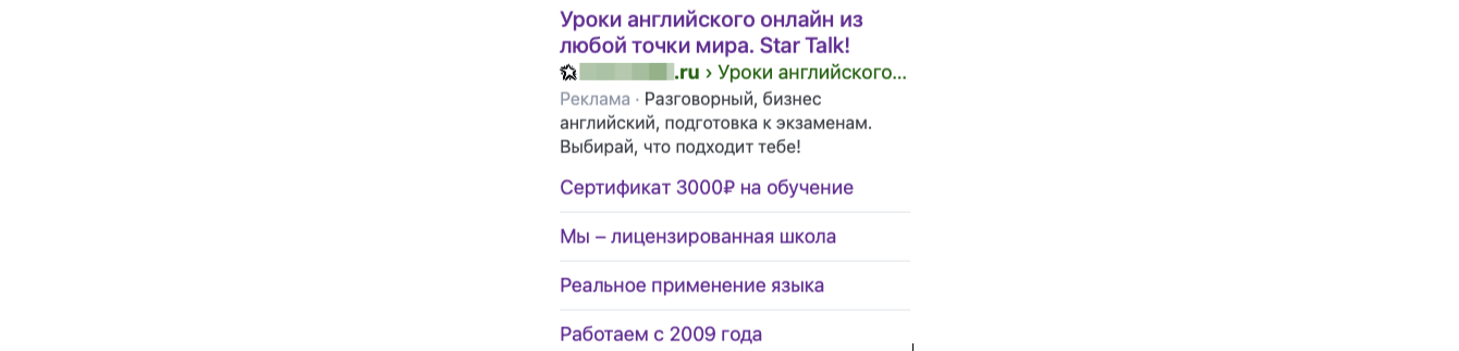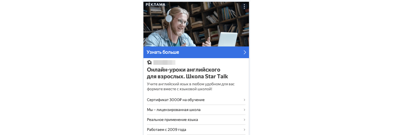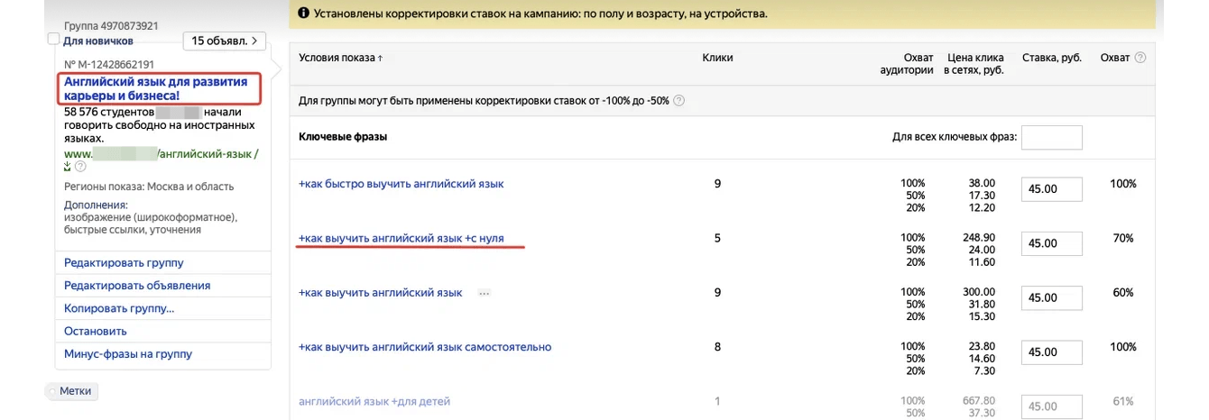 Увидев эффективность Мастеров кампаний мы решили протестировать этот тип кампаний на заграничный трафик. В качестве географии показов были выбраны страны СНГ, Турция и ОАЭ. Продвигаемая услуга — английский онлайн. Примеры объявлений: