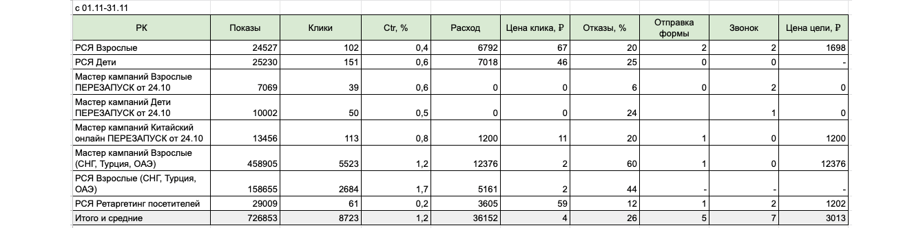 Для этих аудиторий была запущена ретаргетинговая кампания в РСЯ с рекламой акцией «Черная пятница», по которой можно было приобрести курс со скидкой. По итогам ноября мы получили следующую статистику: