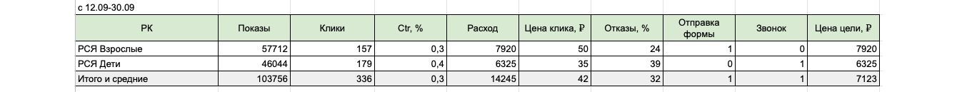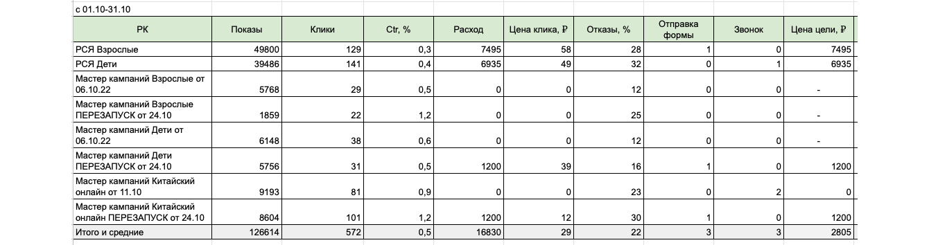 Запущенные рекламные кампании откручивались почти 3 недели. По итогам месяца мы сделали отчет. Сняли статистику из кабинета Директа:
