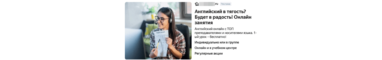 Увидев эффективность Мастеров кампаний мы решили протестировать этот тип кампаний на заграничный трафик. В качестве географии показов были выбраны страны СНГ, Турция и ОАЭ. Продвигаемая услуга — английский онлайн. Примеры объявлений: