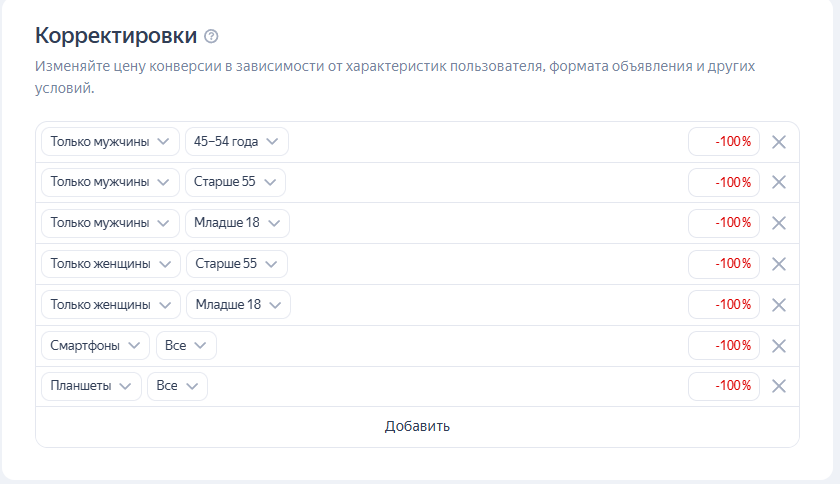 В нашем случае это мужчины и женщины от 25 до 44 лет. На этих людей и будут настроены рекламные кампании.