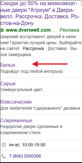 Показываем, как работают объявления с быстрыми ссылками. Нажав на категорию «Белые», пользователь переходит на сайт с уже выбранными фильтрами