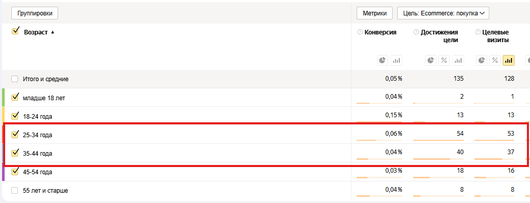 больше всего целевых действий на сайте выполняли пользователи 25-44 лет — наша гипотеза оказалась верной