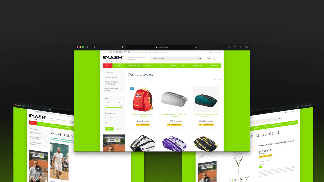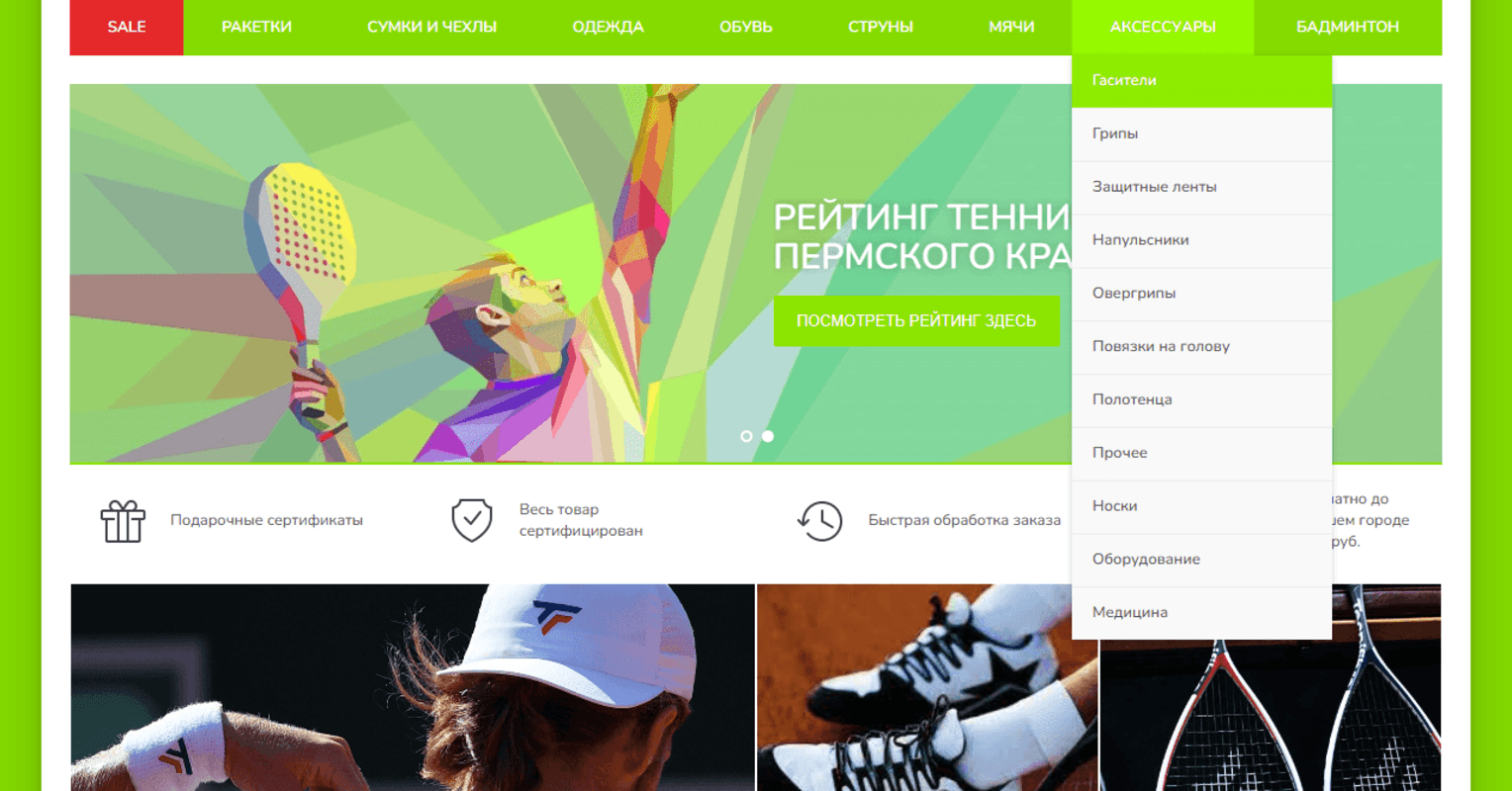 - Сформировано семантическое ядро с акцентом на коммерческие запросы (например, «купить теннисную ракетку», «теннисные мячи Пермь»).