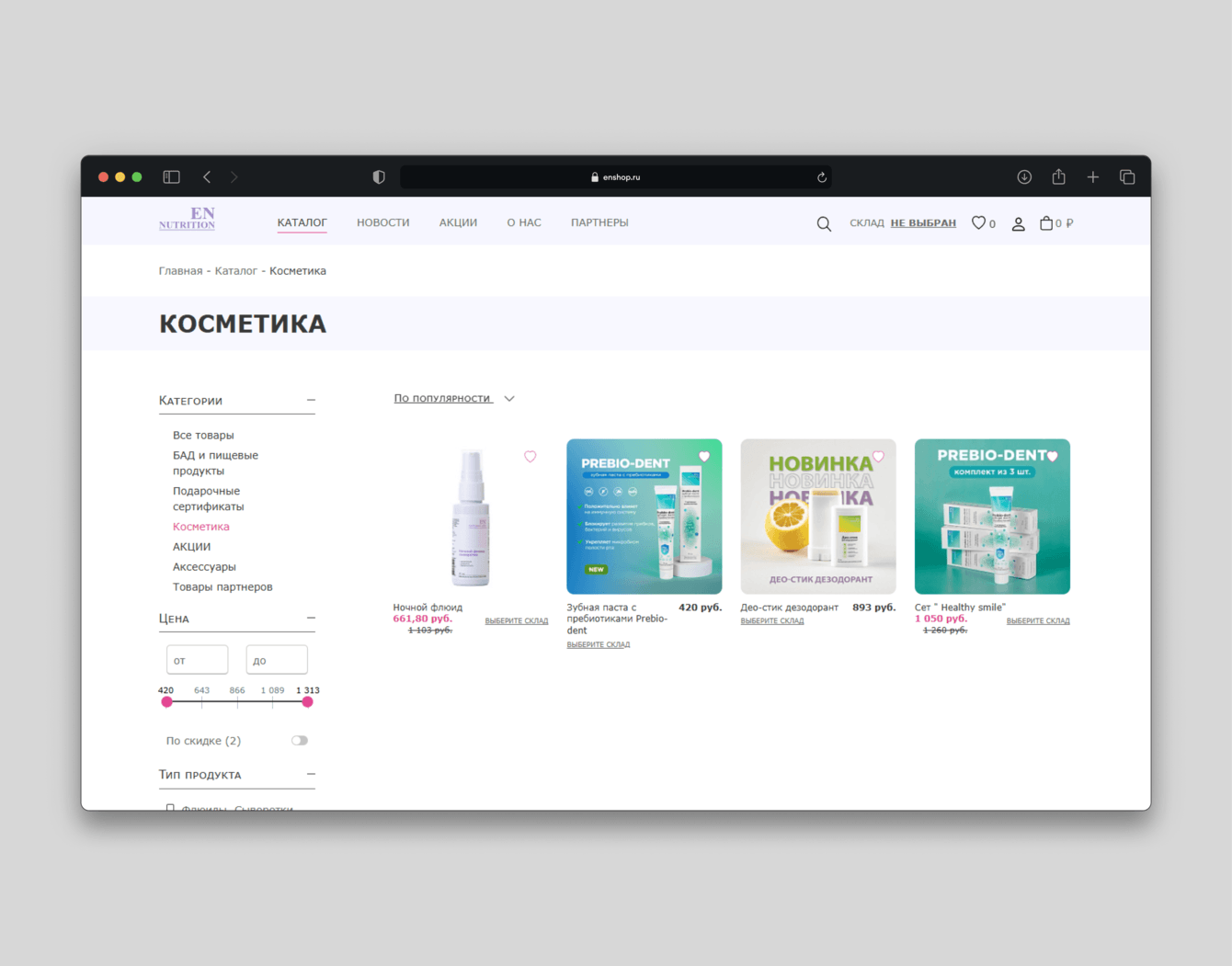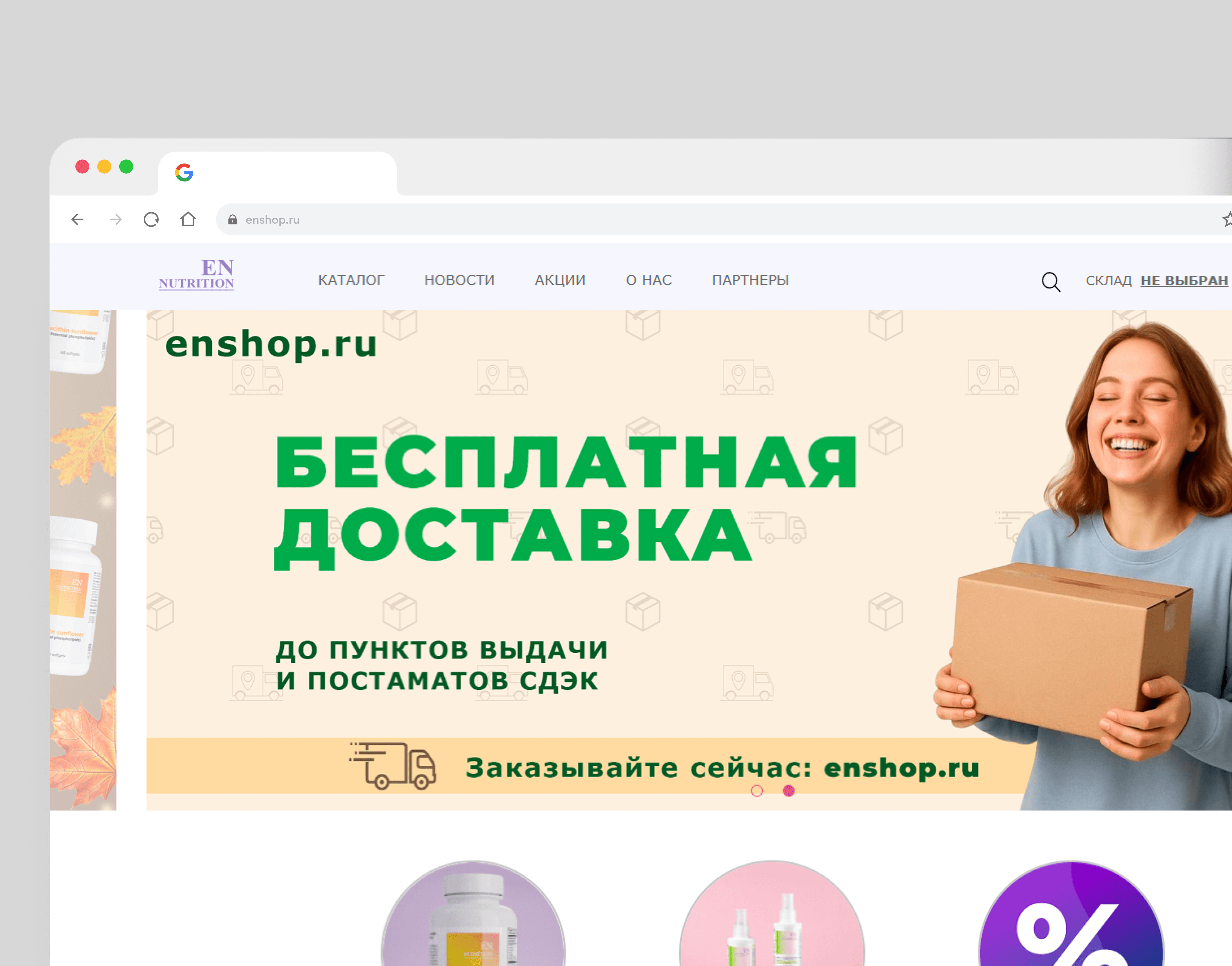 Сайт enshop.ru был создан как удобный и современный инструмент для управления продажами и взаимодействия с клиентами. Интеграция со складами и CRM Битрикс24 обеспечивает высокую эффективность работы, а индивидуальный дизайн подчеркивает уникальность бренда.