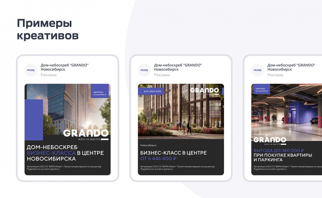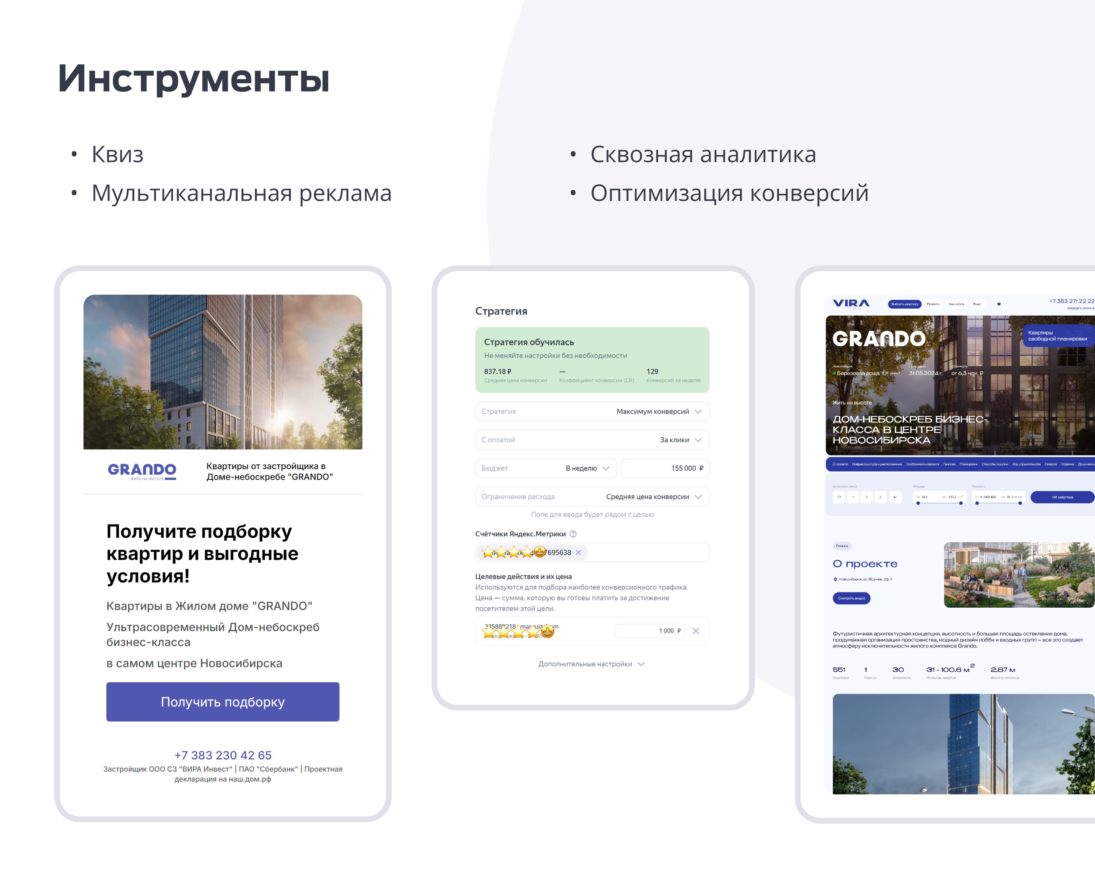 Организовать продвижение дома-небоскреба бизнес-класса. Донести преимущества и ценности объекта, обеспечить необходимый поток обращений. KPI — целевые лиды.