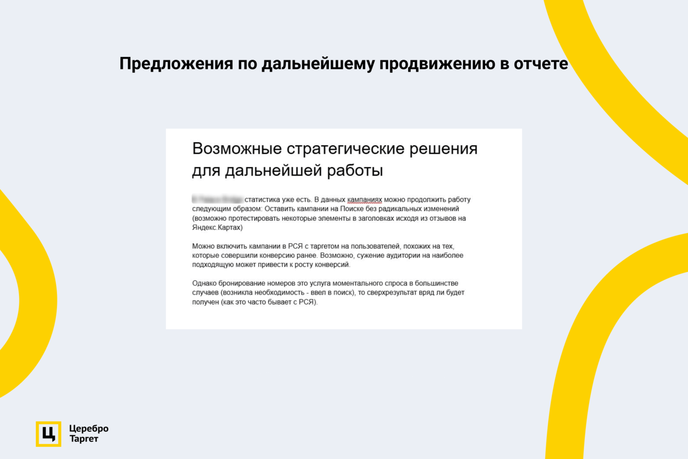 Суть в том, что отель — часть группы компаний, на их проекте утверждения происходят сразу с несколькими командами и руководством. Клиентка мало работала с Метрикой, поэтому хотела иметь на руках презентацию с пояснениями от специалистов, на основе которых можно было принимать бизнес-решения.