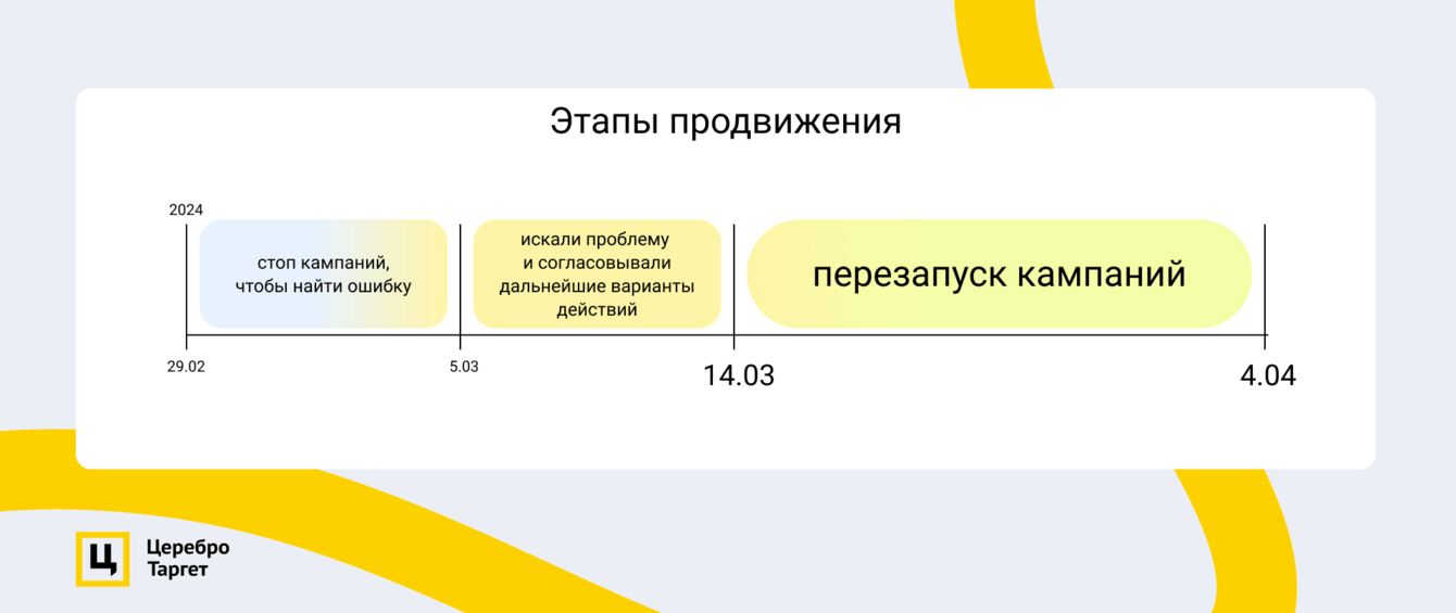 До этого реклама уже показала потенциал Яндекс Директа, маркетолог проекта была заинтересована в том, чтобы найти проблему. Специалисты Церебро остановили кампании, детально проанализировали Метрику, весь кабинет и пообщались с поддержкой.