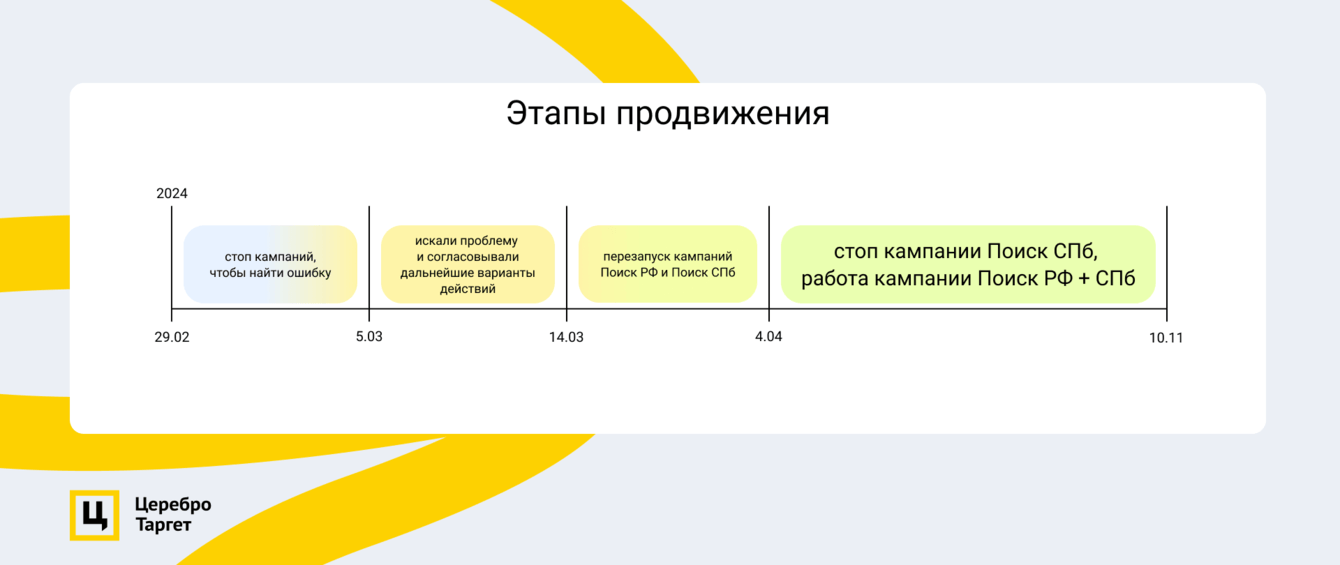 Специалисты Церебро видели потенциал в кампаниях на поиске. Но правильно делать выводы на основе статистики, поэтому на старте нужно было протестировать все места показа.