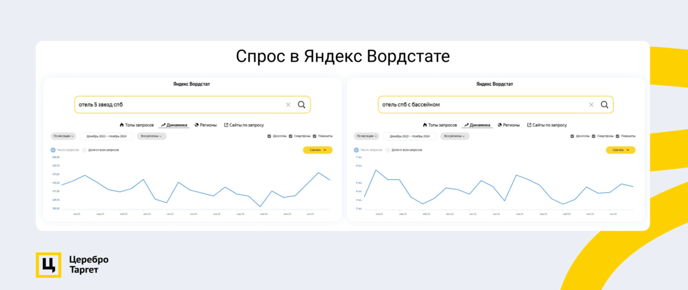 У гостиничного бизнеса в Санкт-Петербурге спрос сформирован. По базовым запросам общий охват составлял больше 1000 запросов, а на пиках переваливал за 5000.