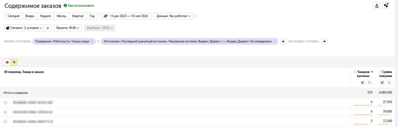 В итоге обсудили вопрос с сервисом и решили подключить электронную коммерцию в Метрике. Для этого изменили настройки счетчика и попросили Travelline внести изменения в коде. В Метрике появился раздел, в котором должны были отражаться id клиента, состав и стоимость заказа. После этого руководители согласовали клиентке дальнейшее продвижение.