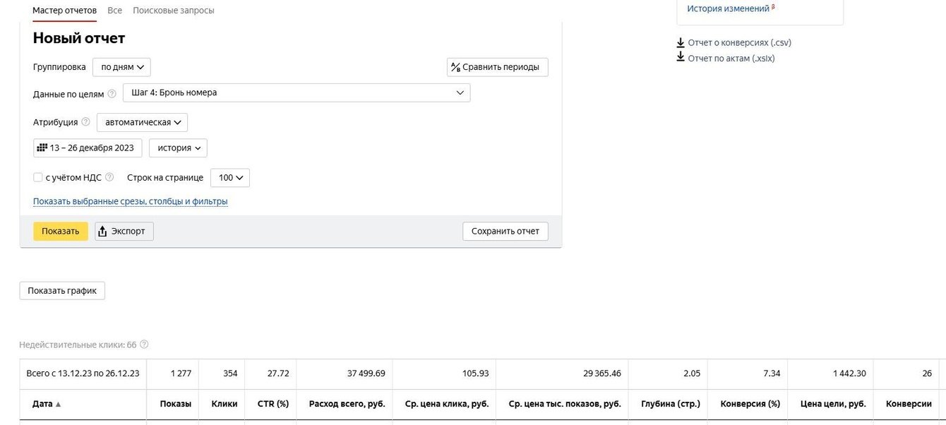 В итоге по аудиту клуба определили, что по продвижению были результаты на поиске даже с некоторыми некорректными настройками и более узким оффером. Это значило, что у места показа был потенциал стать рабочей связкой и для отеля. Проверить это предстояло на тесте после подготовки, создания правильных целей в Метрике и подписания договора.