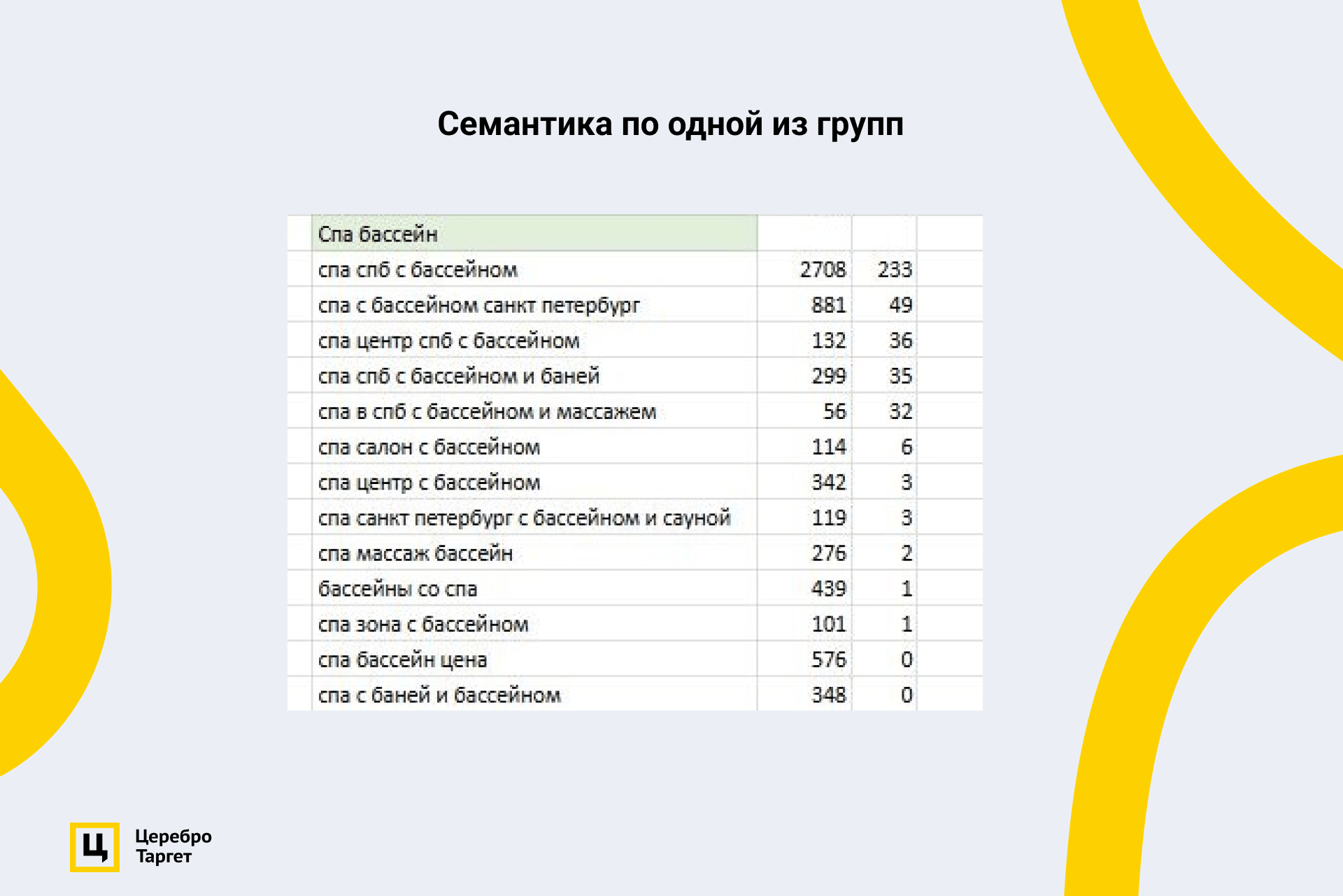 Специалисты Церебро изучили страницу и на основе данных собрали семантическое ядро. Группы запросов разделили по смыслам: «гостиница в Петербурге», «с детьми+», «семейный+», «отель со спа+». Всего получилось 38 групп.