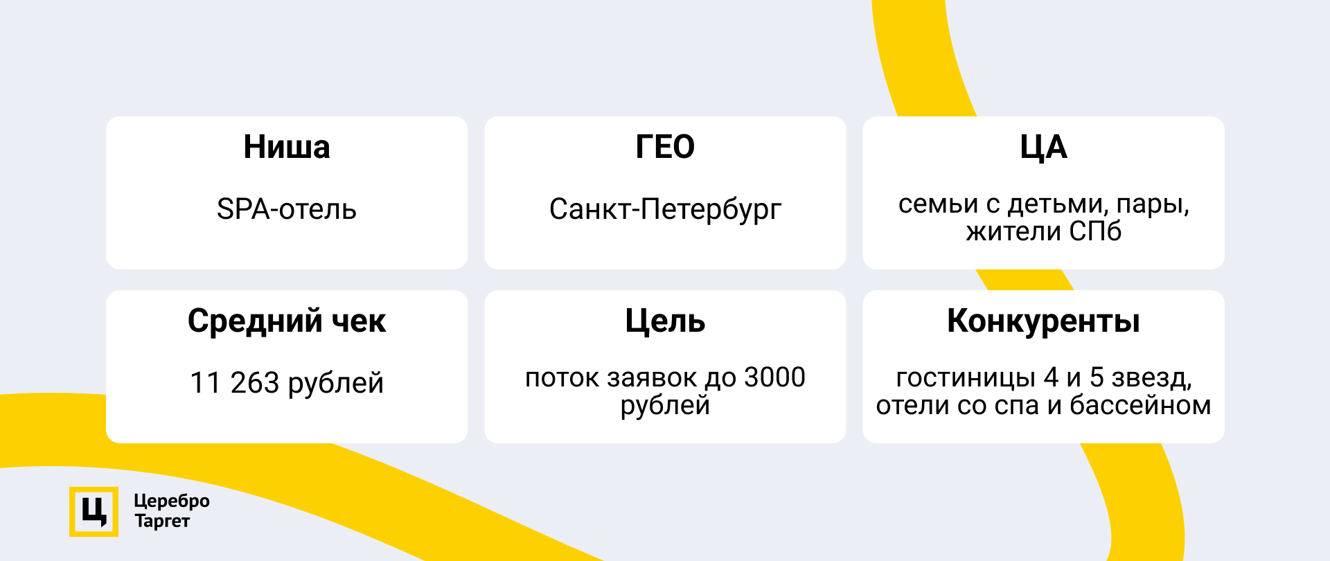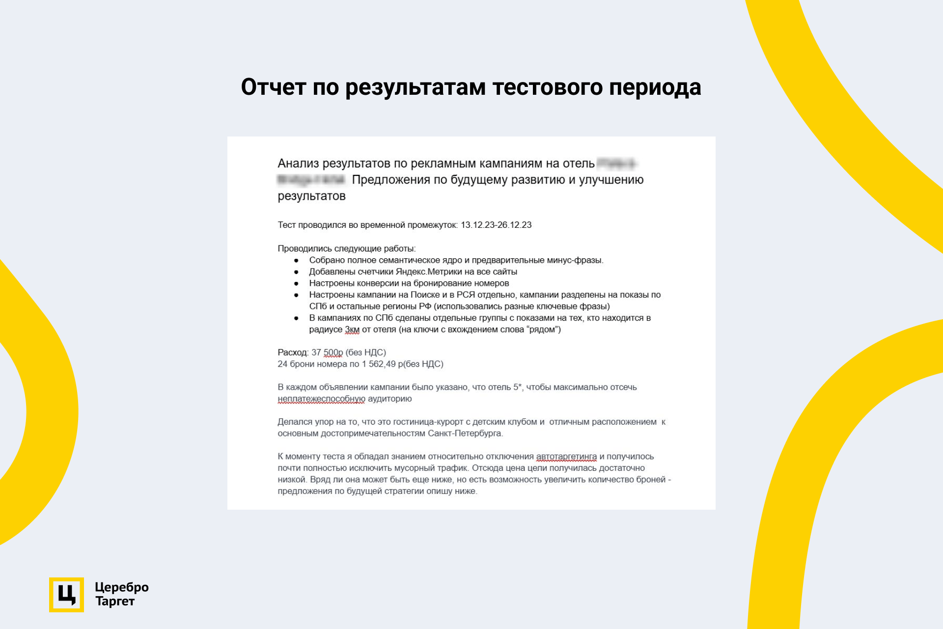 В итоге по аудиту клуба определили, что по продвижению были результаты на поиске даже с некоторыми некорректными настройками и более узким оффером. Это значило, что у места показа был потенциал стать рабочей связкой и для отеля. Проверить это предстояло на тесте после подготовки, создания правильных целей в Метрике и подписания договора.