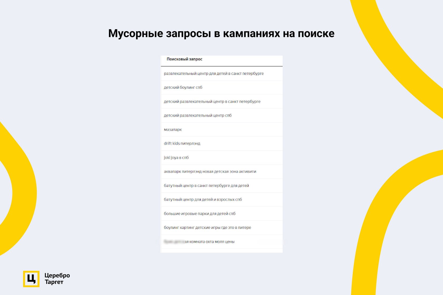 3. Мусорные запросы в кампаниях на поиске. Реклама приносила заявки, но трафик по поисковым кампаниям можно было сделать чище. Когда нет корректировок по запросам, то часть грязного трафика приводит нерелевантную аудиторию.