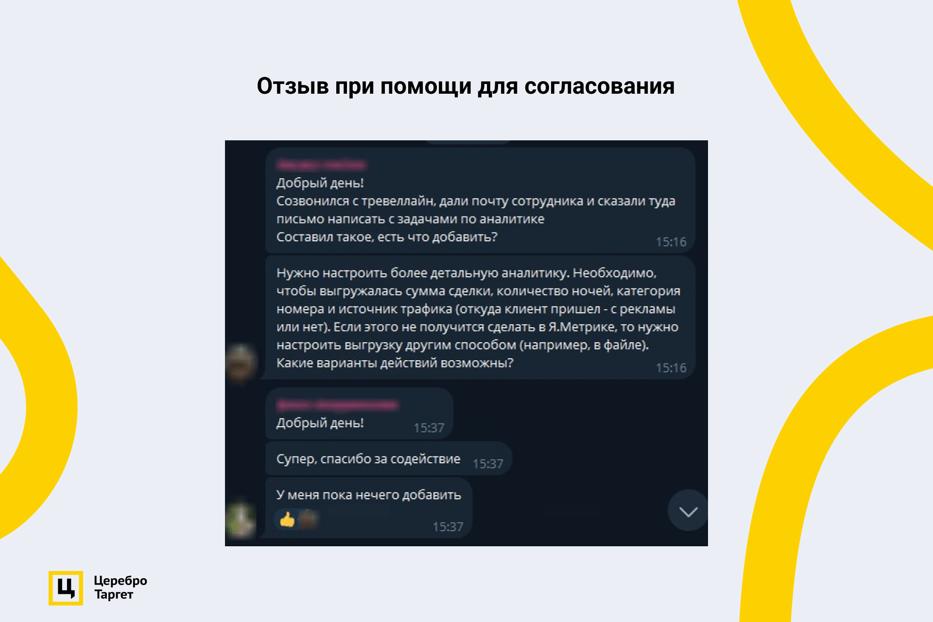 Суть в том, что отель — часть группы компаний, на их проекте утверждения происходят сразу с несколькими командами и руководством. Клиентка мало работала с Метрикой, поэтому хотела иметь на руках презентацию с пояснениями от специалистов, на основе которых можно было принимать бизнес-решения.