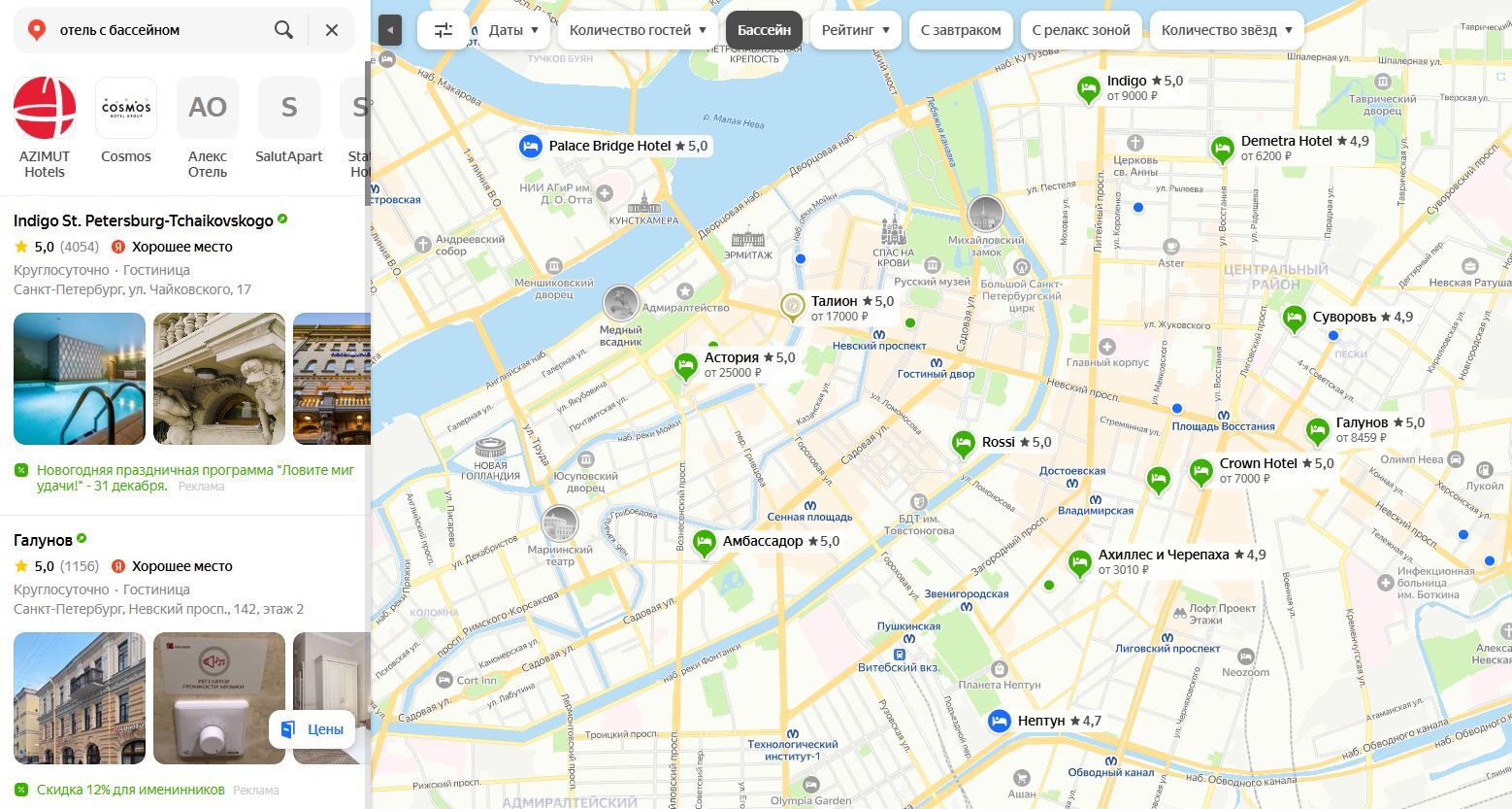 Также в Санкт-Петербурге большой выбор отелей с бассейном. Они конкурируют с нашим проектом за внимание второго сегмента аудитории — местных жителей.