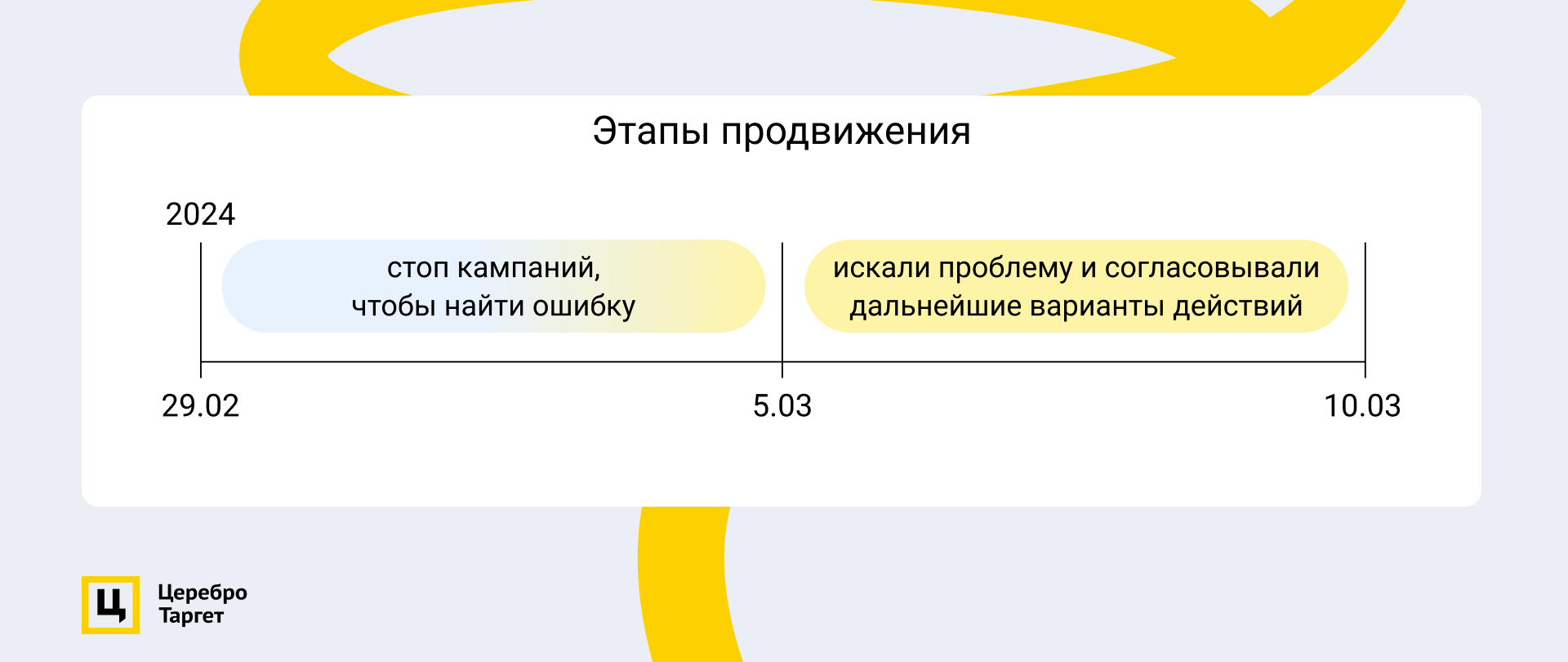 До этого реклама уже показала потенциал Яндекс Директа, маркетолог проекта была заинтересована в том, чтобы найти проблему. Специалисты Церебро остановили кампании, детально проанализировали Метрику, весь кабинет и пообщались с поддержкой.