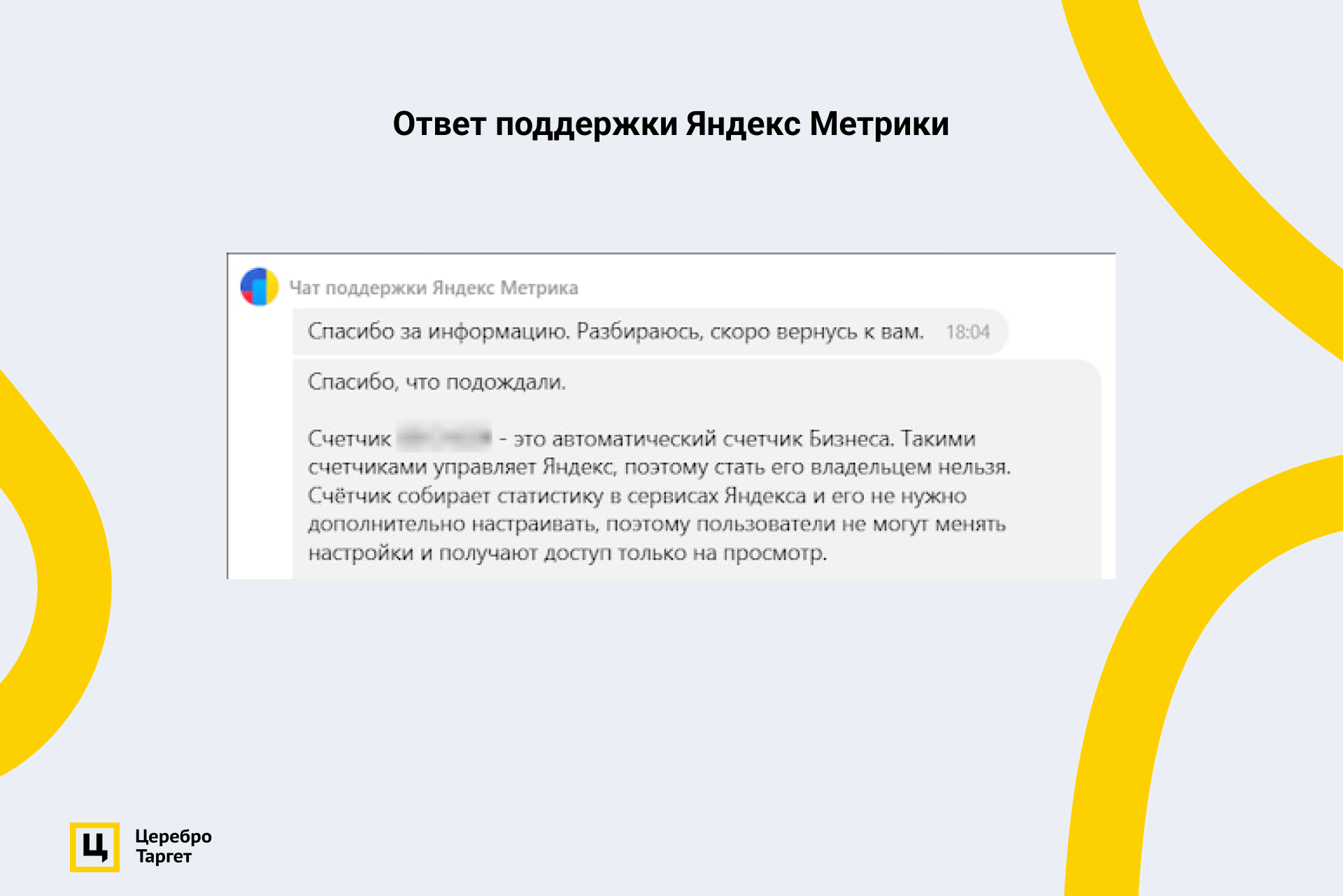 К сайту уже был подключен счетчик Метрики, но специалисты Церебро обнаружили проблему. Оказалось, он был создан автоматически — у представителей проекта был доступ только на просмотр. При таких настройках невозможно вносить изменения и создавать цели.
