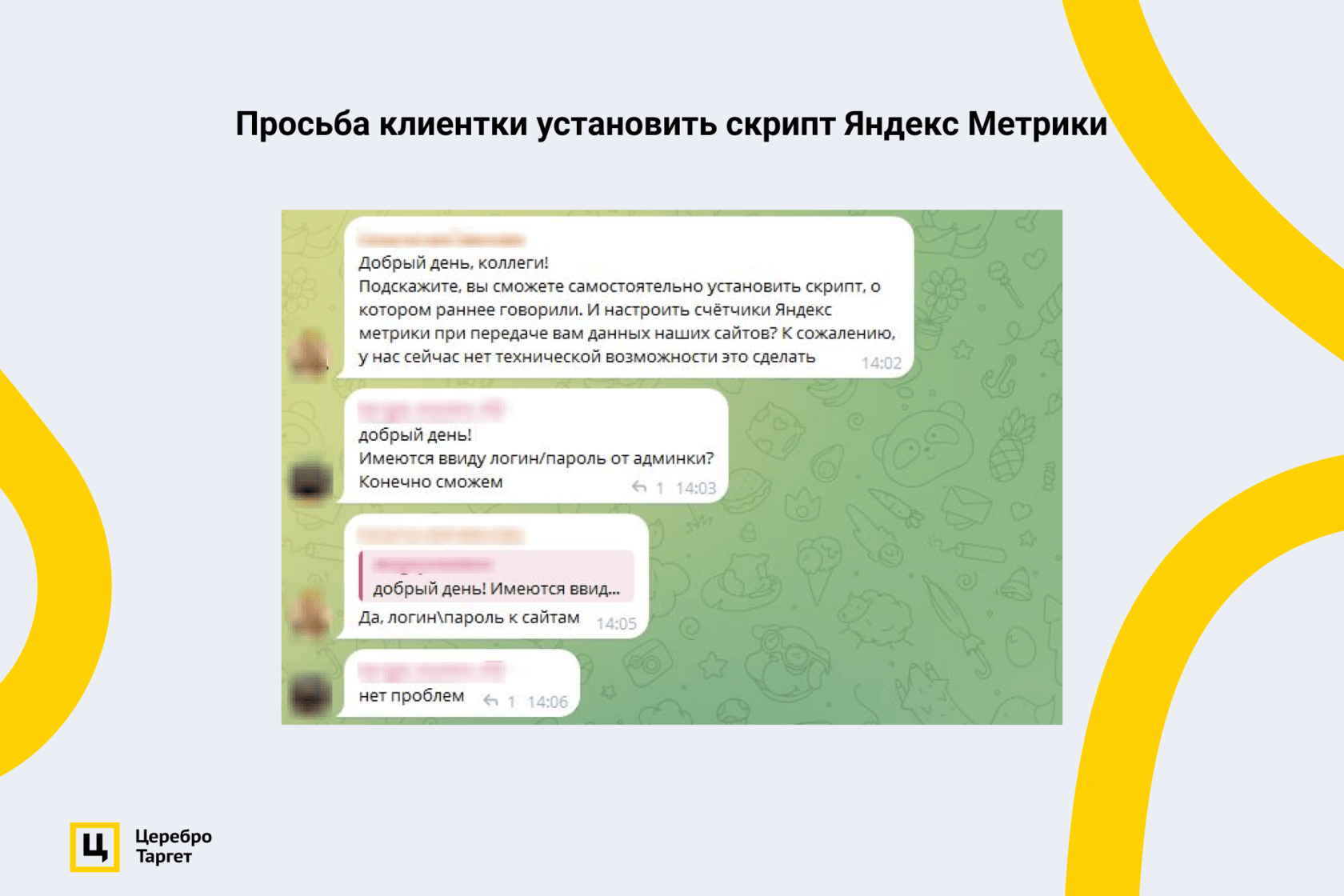 Клиентка выдала доступ к сайту и попросила специалистов самостоятельно установить на него код. В итоге и у нас, и у проекта был полноценный доступ к Метрике.