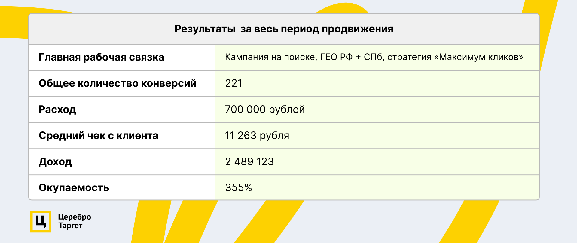 При расходе 700 000 рублей окупаемость составила 355%. Такой результат удовлетворил клиентку и руководителей.