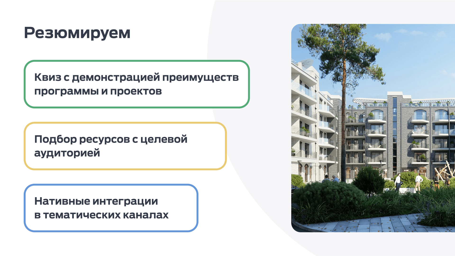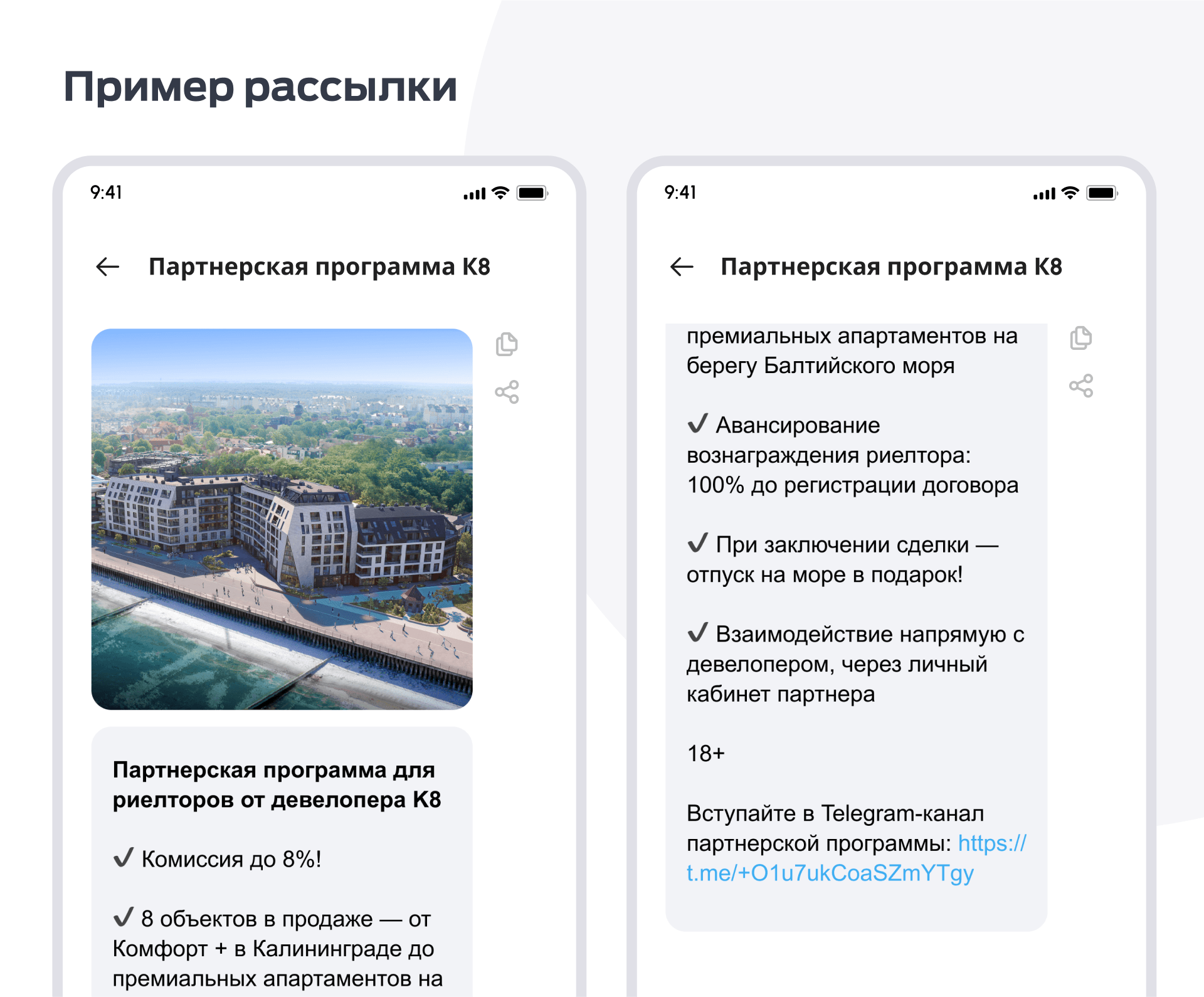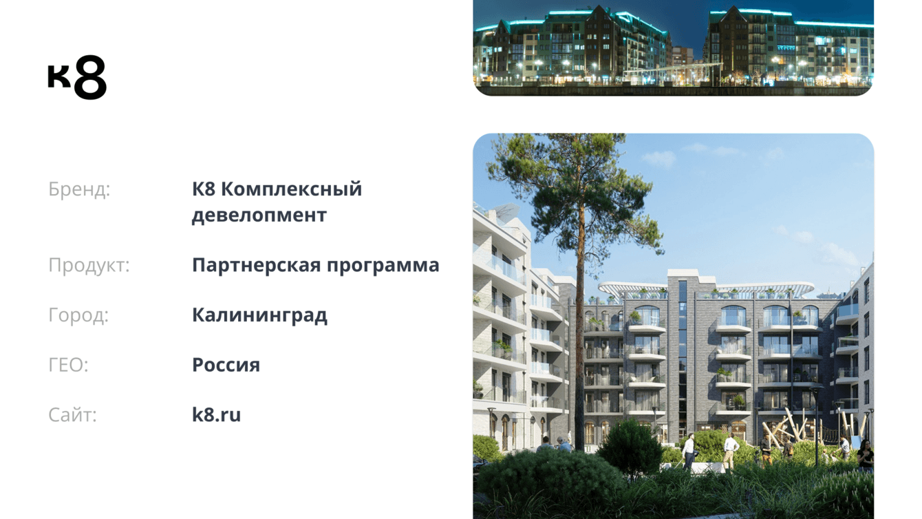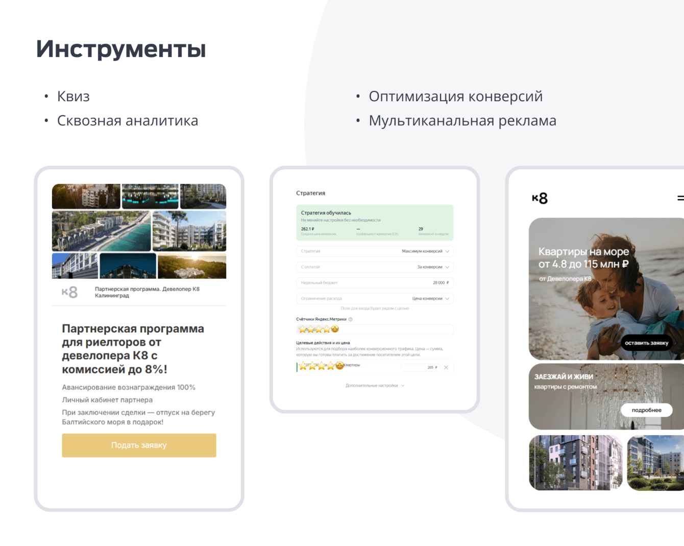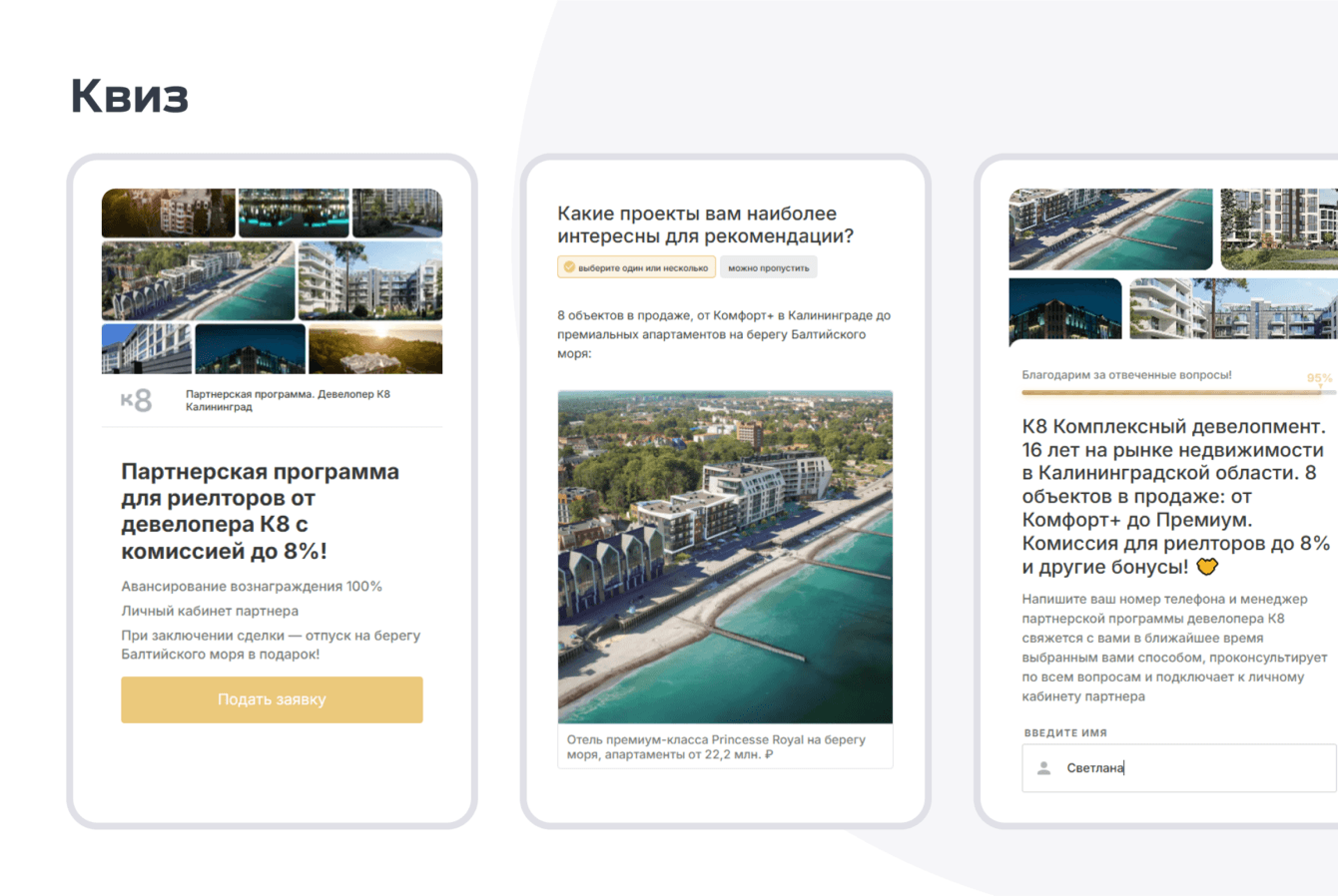 Продвижение партнерской программы для риэлторов от крупного девелопера в Калининградской области К8. Квиз с демонстрацией преимуществ программы и объектов для реализации. Подбор ресурсов с целевой аудиторией. Нативные интеграции в Telegram в тематических каналах.