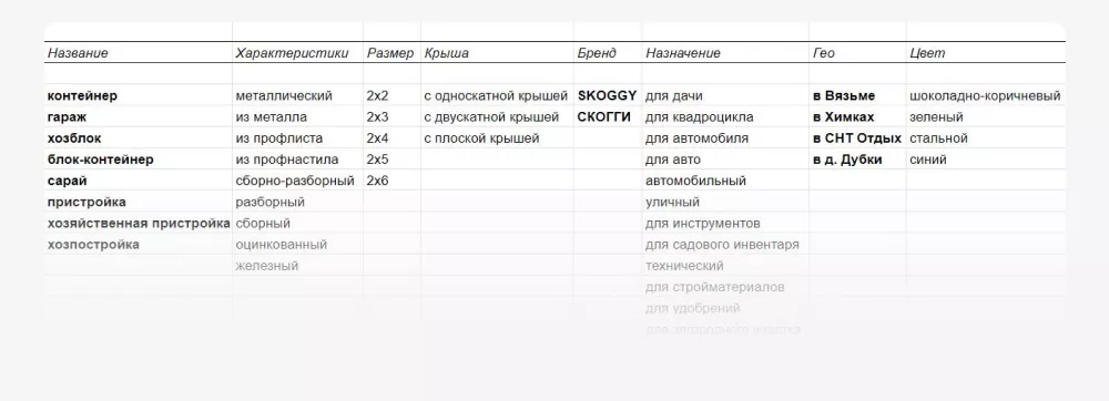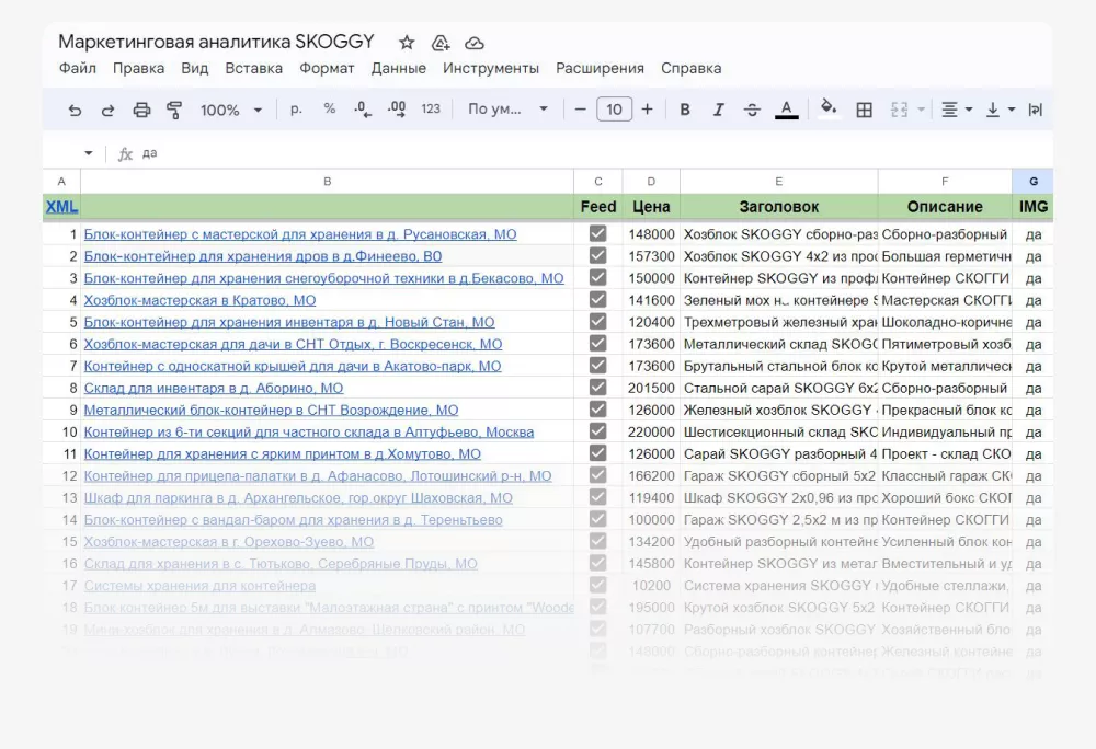 Ниже прописывается цена. Далее – заголовок и описание. На начальном этапе обозначили критерии, которые необходимо учитывать при написании заголовка и описательной части. В первую очередь, это важные свойства блок-контейнеров (сборно-разборные, металлические), название продукта (хозблок, гараж, сарай, блок контейнер и т.д.), размер и, конечно же, бренд. Для удобства набросали возможные варианты (эпитеты, синонимы), чтобы разнообразить рекламные смарт-объявления.