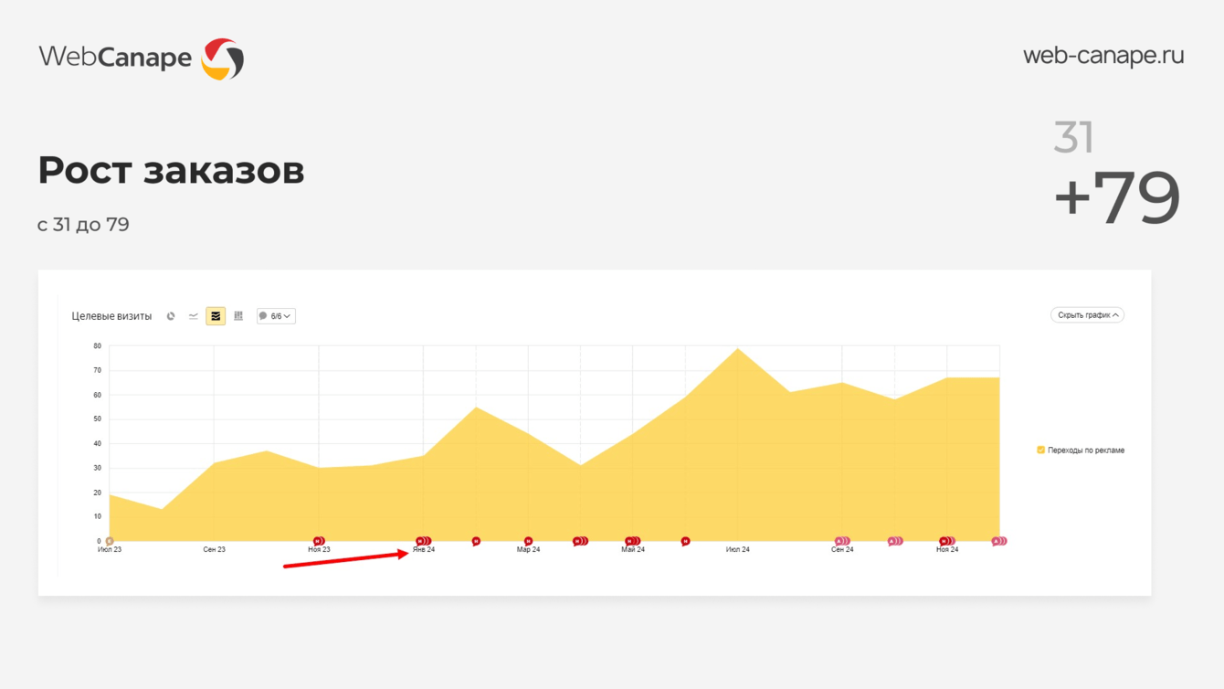 По мере обучения кампании уже в феврале заказы выросли с 31 до 55, а в июле клиенты сделали уже 79 покупок. С учетом того, что кампании были запущены только на категории товаров с высоким средним чеком, реклама стабильно окупалась. Таким образом, после старта ЕПК мы добились более чем 60% роста целевых обращений.