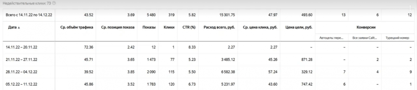 Запустили поисковые кампании 20 ноября на ручном управлении, 23 ноября подключили сетевые кампании на автростратегии с оплатой за конверсию. После анализа сетевых кампаний приняли решение поменять на автостратегию с оплатой за клики с ограничением по средней цене цели “переход в мессенджер” в 300 руб. в неделю, таким образом получилось увеличить объем трафика.