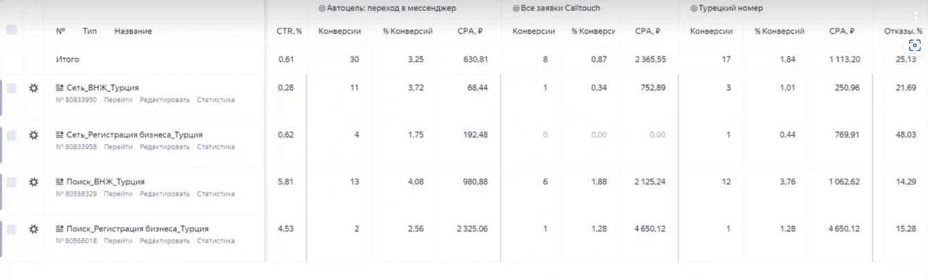 Дешевые обращения поступили с сетевых кампаний, но наибольший процент отказов и ниже CTR. С поисковых кампаний больше обращений и по более высокой цене, т.к. аукцион разогрет и для показа на верхних позиция высокие ставки