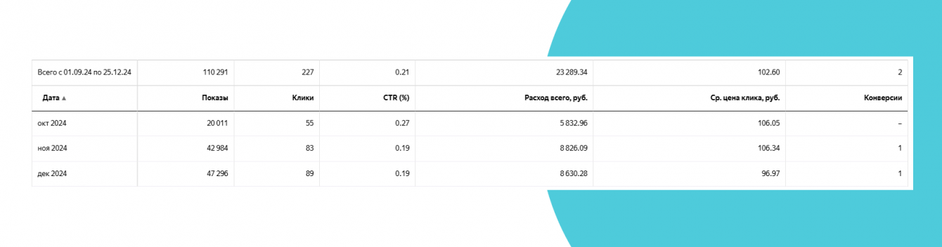 По показателям видим, что весь октябрь кампания «разгонялась». Училась, училась и ещё раз училась после наших корректировок. Для небольшого расхода результаты хороши, допом привели 2 конверсии (звонки).
