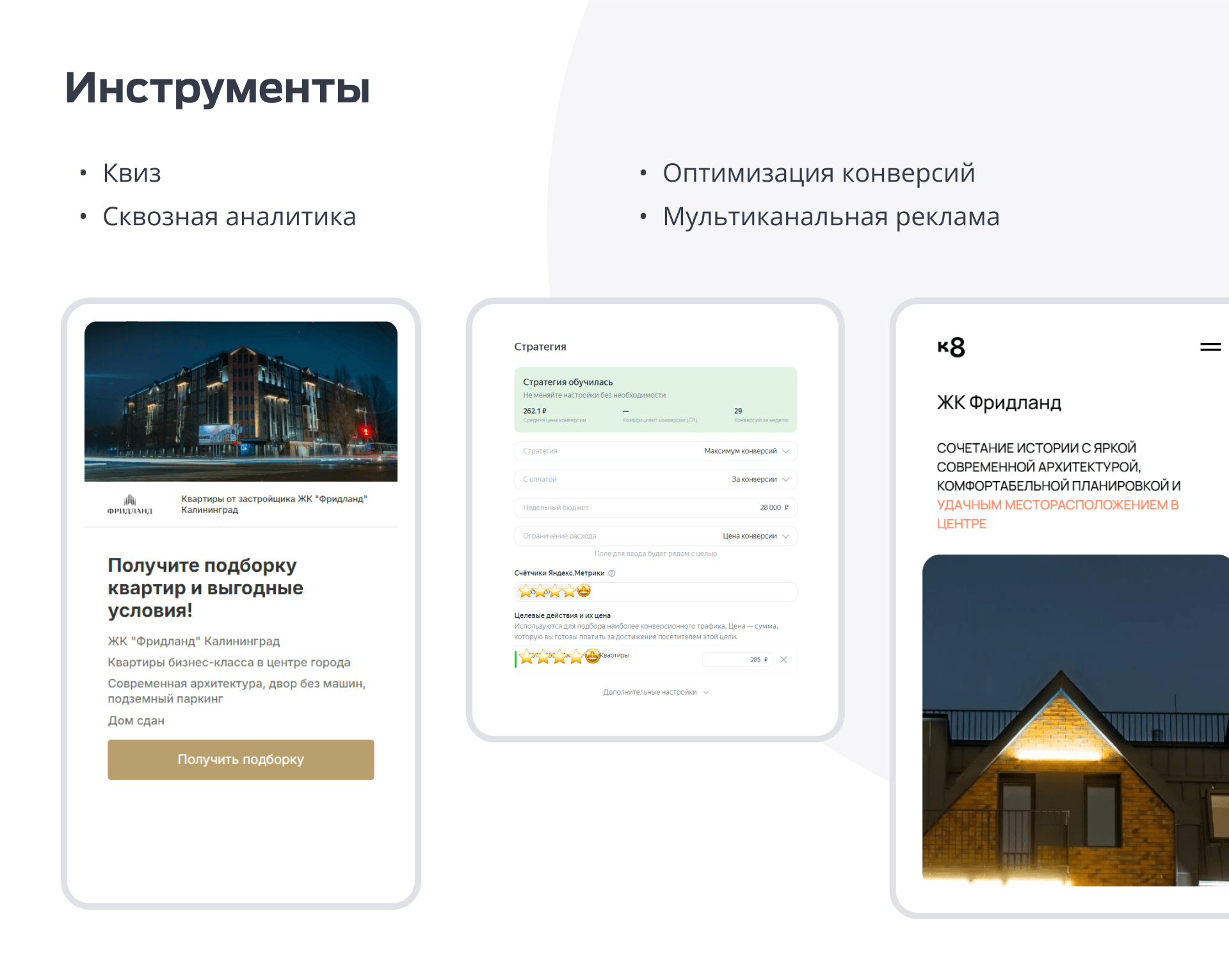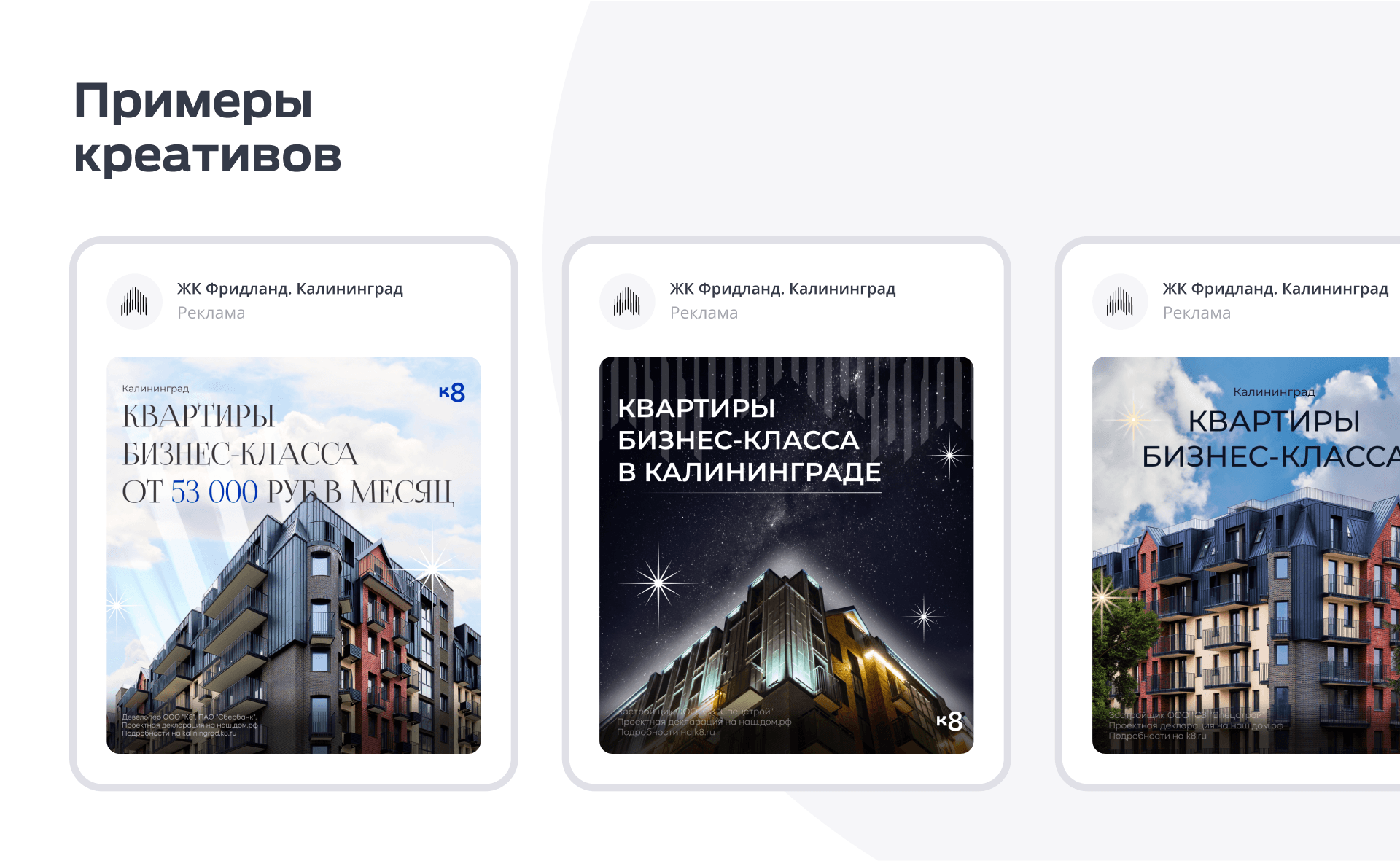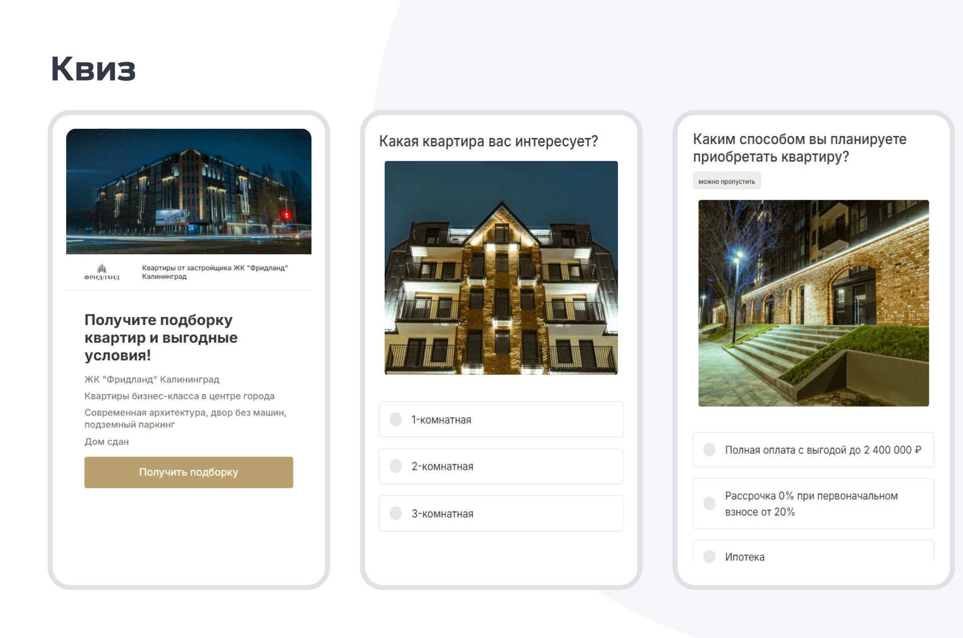 ЖК бизнес-класса в историческом центре Калининграда. Обеспечить охват по Калининградской, Московской и Ленинградской областях. Создать квиз с отправкой подборки квартир по SMS. Настроить таргетированные рассылки по посетителям сайтов аналогичных объектов и ресурсов с платежеспособной аудиторией. Настроить нативные интеграции в Telegram в тематических каналах.