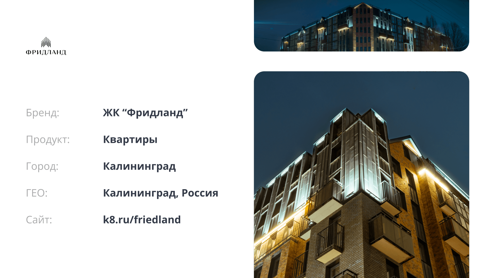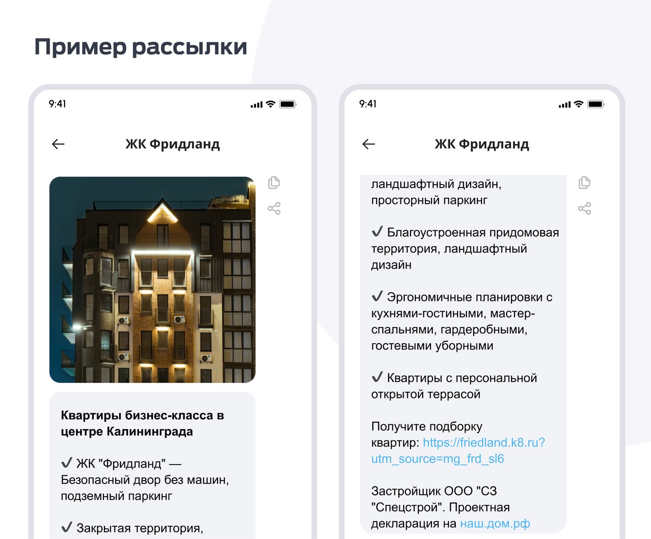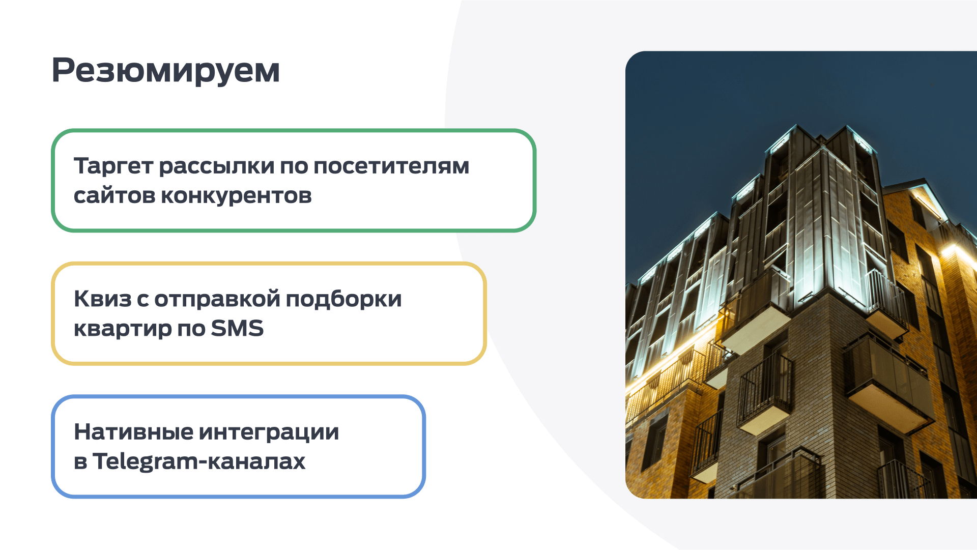 ЖК бизнес-класса в историческом центре Калининграда. Обеспечить охват по Калининградской, Московской и Ленинградской областях. Создать квиз с отправкой подборки квартир по SMS. Настроить таргетированные рассылки по посетителям сайтов аналогичных объектов и ресурсов с платежеспособной аудиторией. Настроить нативные интеграции в Telegram в тематических каналах.